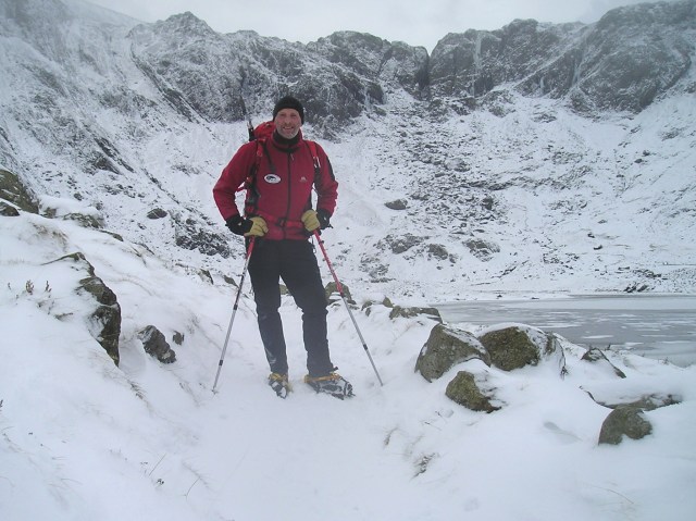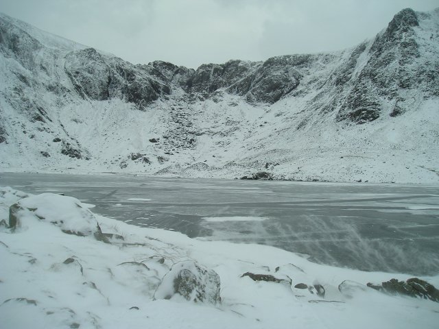 So, I had a drive round to Ogwen, and had a wander round Cwm Idwal. The cloud base was higher, but dithering about over at Nantlle had left it a bit late to do anything more worthwhile. As it was, the scenery was great, if you are into winter monochrome! The cliffs of the Devil’s Kitchen (Twll Du) were especially dramatic, with a very spectacular icefall in evidence.