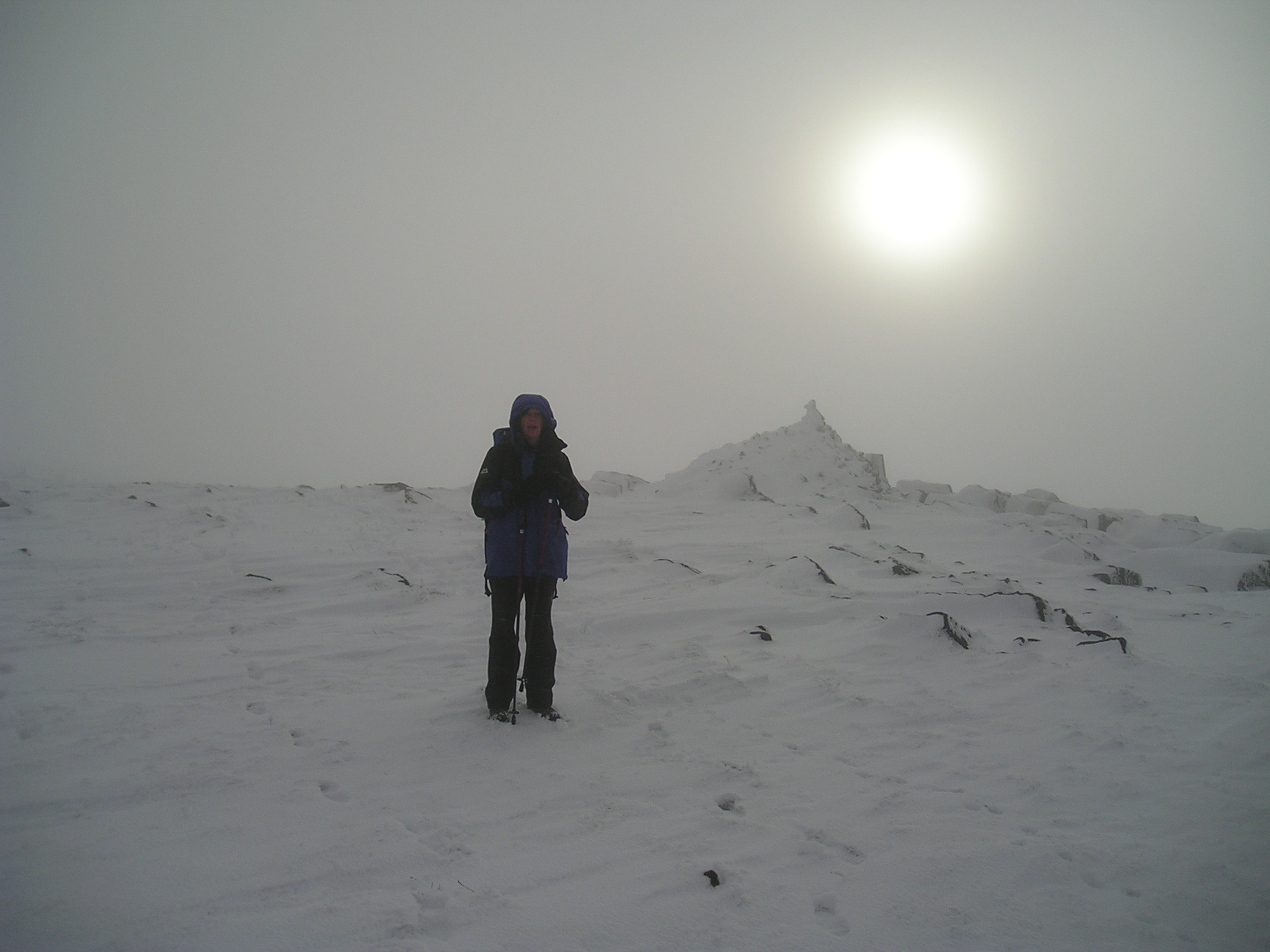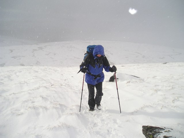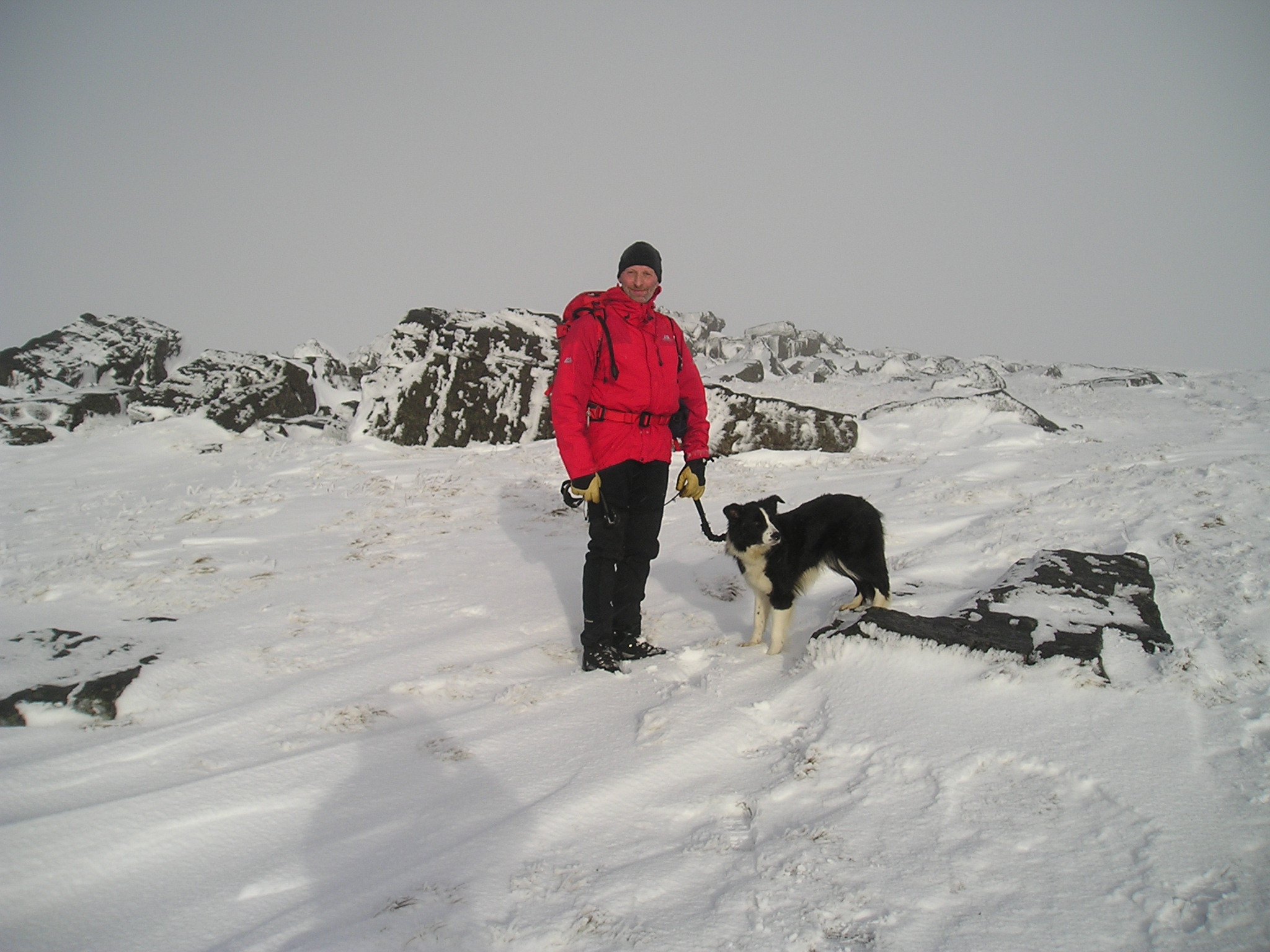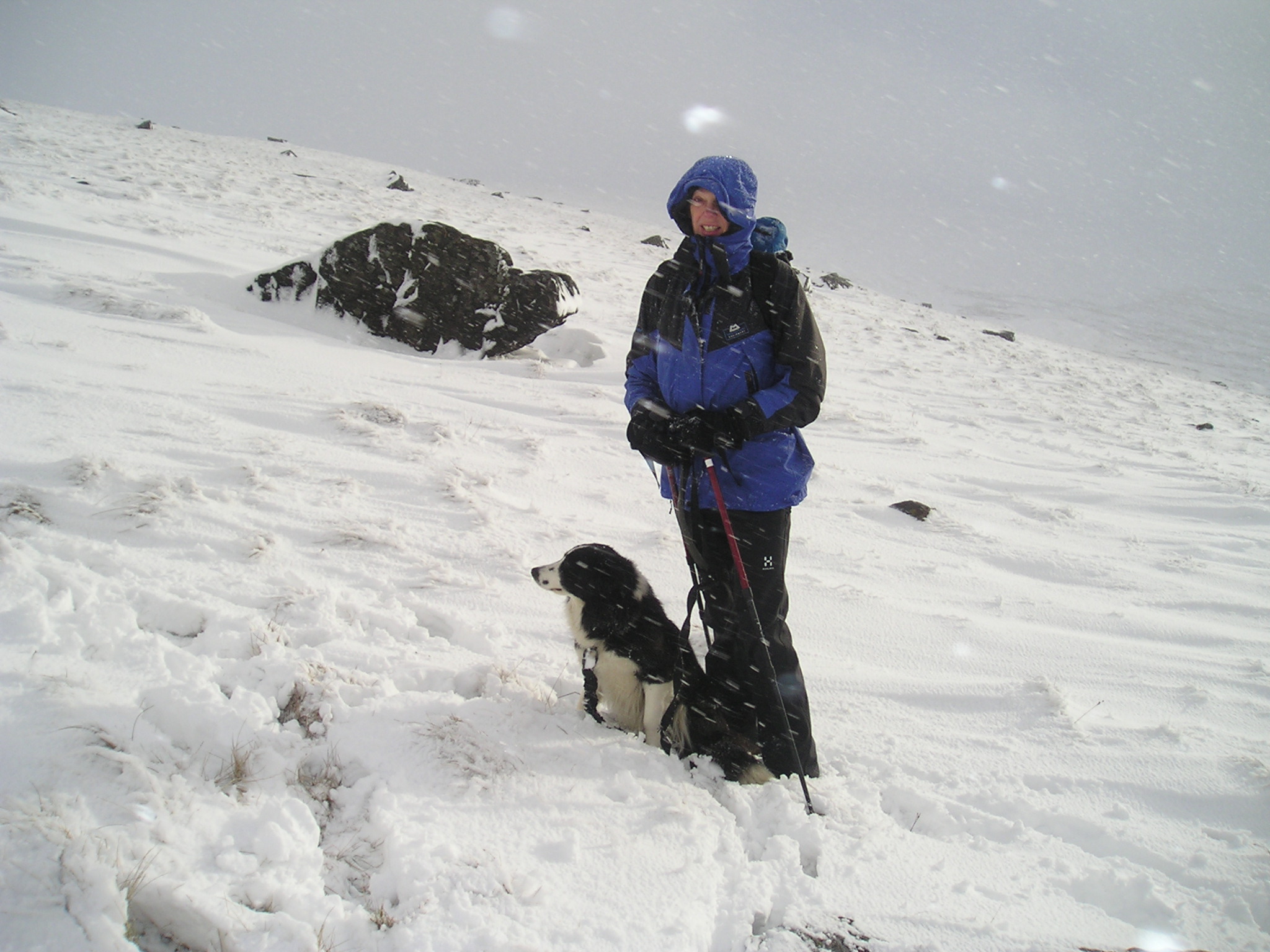 One thing I emphasise when talking to people about navigation is the importance of not becoming distracted by strong crosswinds, people nattering at you, etc.  Well, I did let myself get distracted in the mist by the other “Mist”, our Border Collie.  It’s a useful trick when “slightly misplaced” to recognize the fact early, but although only about ten degrees off course it took thirty minutes extra time plodding through knee-deep snow to relocate on a good navigation handrail (a stone wall).  From here all that remained was a simple descent.
