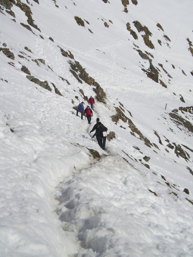 My scariest mountain moment this week was in the comfort of my own back garden.  My window cleaner was telling me about his walk up Helvellyn a couple of weeks ago.  They had gone the long way round (Grisedale Tarn probably, but he didn’t know the route) and found the top pretty well covered in snow.  Not wanting to risk a descent of Striding Edge, they had opted to go down Swirral Edge instead.