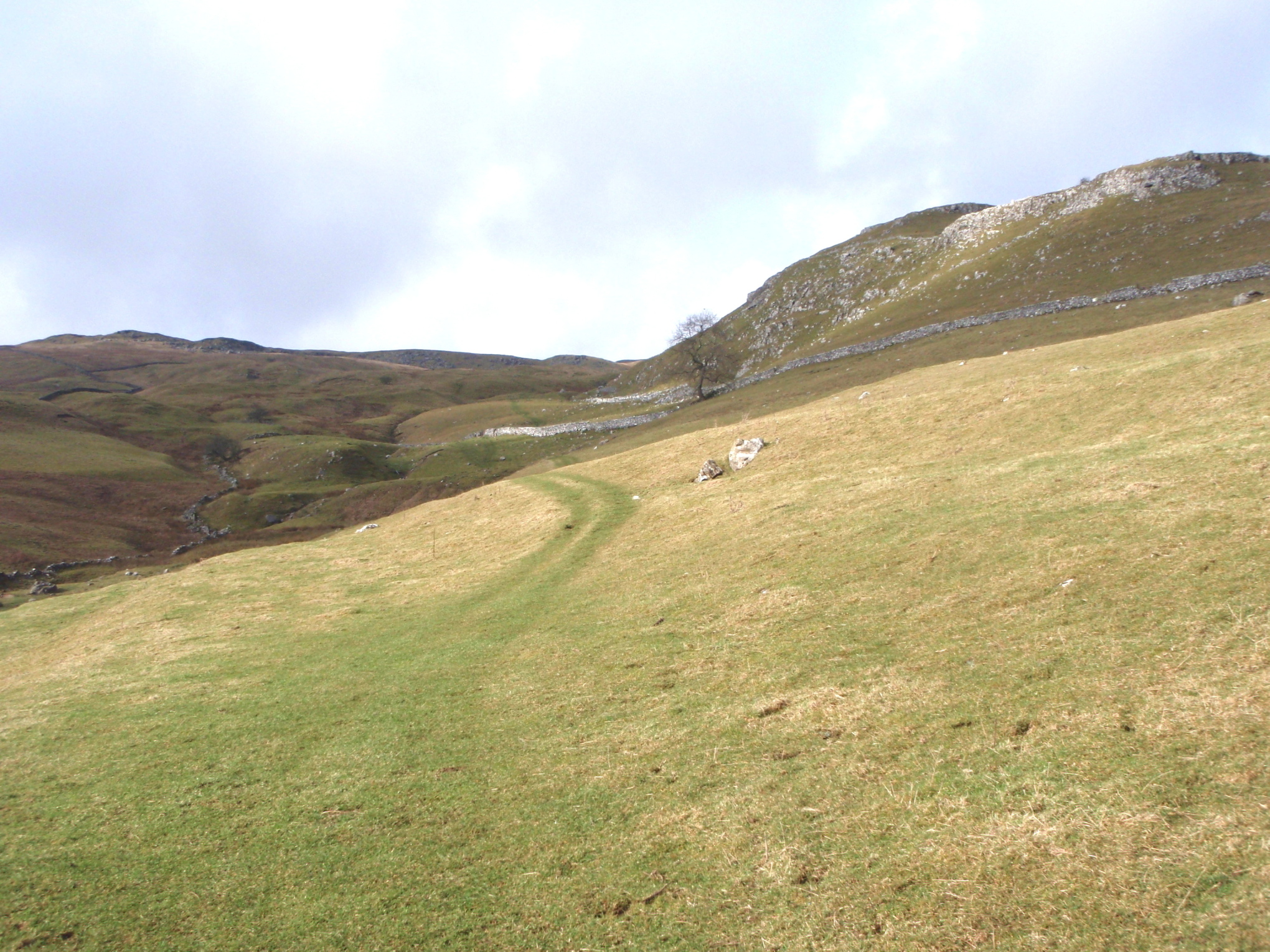 Which is exactly what we did. The path, heading northwest by Hoober Edge, gained height in good style, and gave us unexpected views of familiar sights such as Malham Cove, and new sights like the small waterfall above Butterlands Barn. Old mine workings just below Kirkby Fell added extra interest before we reached the Bridleway heading towards Settle.