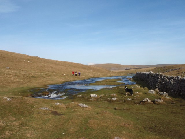 Just beyond the dry valley is “Water Sinks”, where the stream from Malham Tarn disappears underground, to reappear not at the foot of the Cove, as you might expect, but at Aire Head springs just south of Malham village. Today, though, someone had moved Water Sinks! There was so much water from the previous storms that the stream now extended 400 metres beyond Water Sinks before disappearing down another hole.