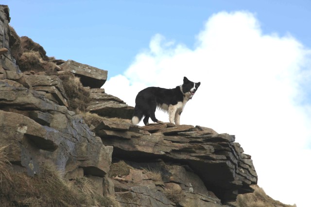 The first part of the route is just “steady away” as they say up north, gradually gaining height in a relatively painless way. When the path joins the Pennine Way things start to get steeper, but a succession of small crags, limestone at first followed by gritstone, make a series of interesting mini-scrambles that provide suitable entertainment. Even the dog was having a good time, but unfortunately the rock doesn’t last long, and we were soon on the summit.