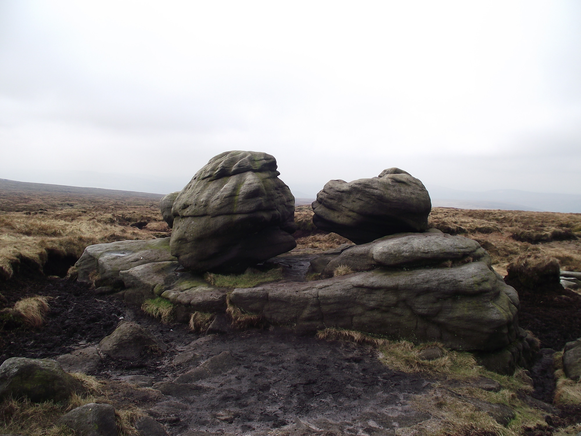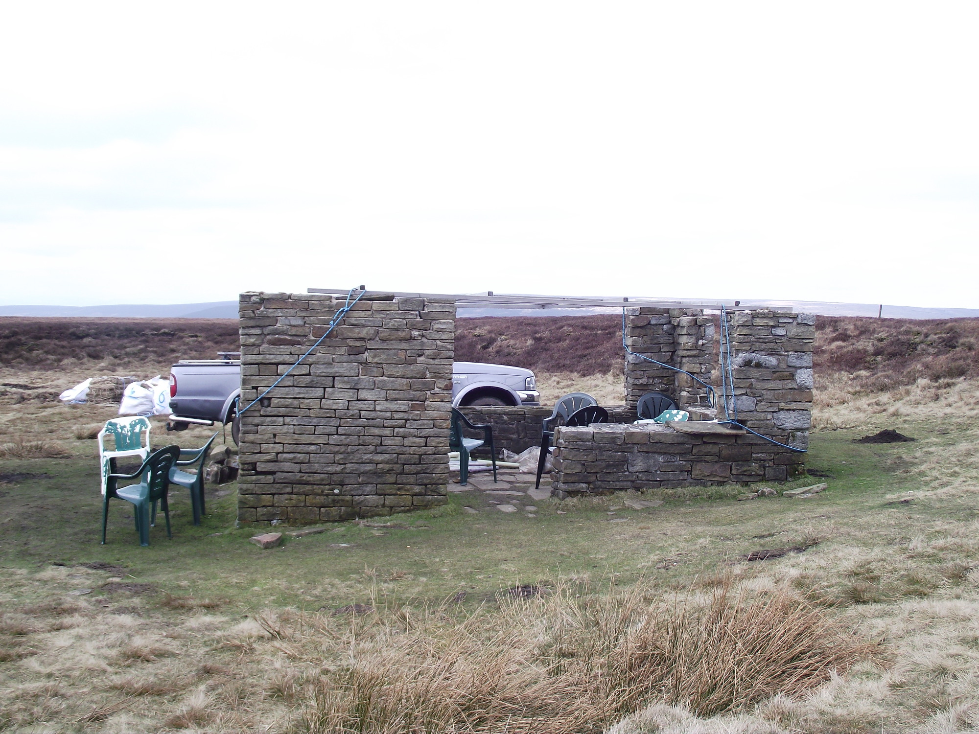 From the Wain Stones, a path heads down next to a stream, heading for the junction with Wildboar Grain that I had passed earlier. My route from there was over Harrop Moss, where I encountered the first true Pennine walking of the day – wet, sticky, black peat! A succession of wooden duckboards kept me out of the worst of it, and took me to a curious looking construction high on the moors at about 480 metres altitude. It looked like a suburban patio had been dropped there, but a more likely explanation is that it’s a shelter for shooting parties; the duckboards were probably also for shooters.