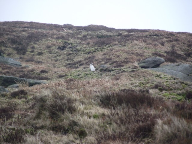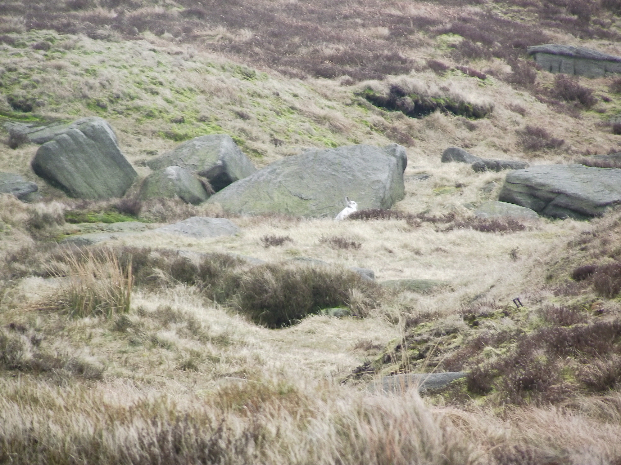 I heard a curlew but didn’t see it, but I did see white hares – three at least, possibly four. The Mountain Hare (Lepus timidus) is a relative of the Arctic Hare and is more usually seen in Britain in the Scottish Highlands. The hare is not originally native to Derbyshire, and was introduced for the hunting entertainment of the local gentry. Their white coat makes them quite visible on the moors at this time of year (early spring), but the longer days soon trigger a response that turns the hare’s coat back to a more useful camouflage brown.