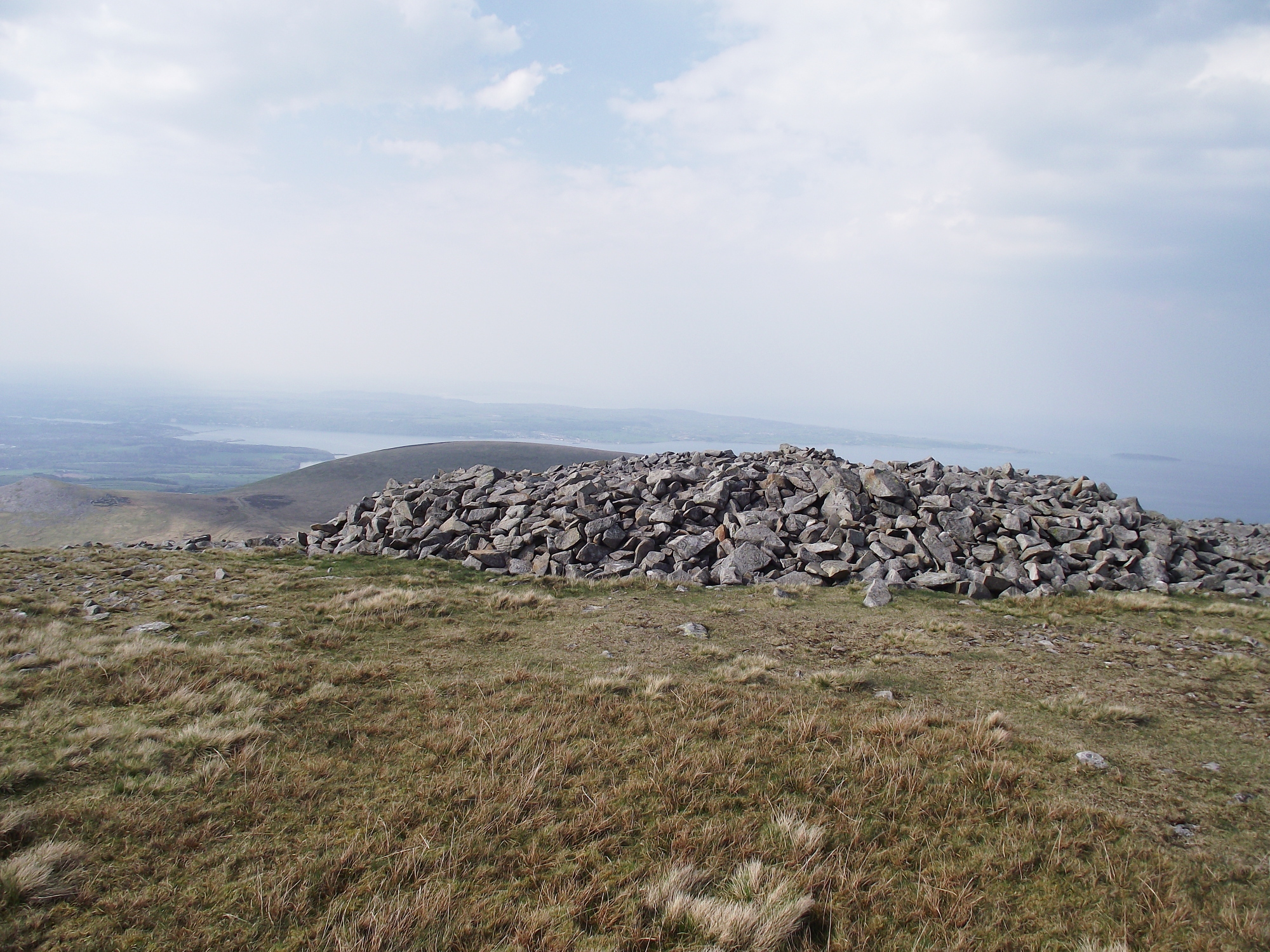 The long way back in this case was entirely different in character to the outward section – a long, grassy switchback of a ridge, very much moorland in appearance, with the addition of interesting craggy outcrops along the way.  The sunny weather had inevitably led to hazy light conditions, not the best for photography or long distance views, but you can’t have it all.  Eventually we reached Drosgl, our last peak of the day.  The drama here was man-made – a huge Bronze Age burial cairn on the summit.  An impressive place, with a sense of history.