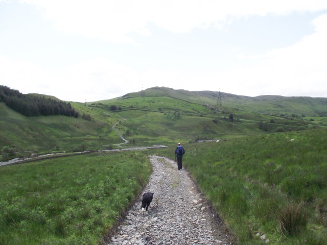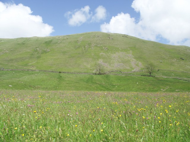 From there it was a pleasant walk down an easy track heading back towards the start point. We passed quickly through flower meadows that you would never find in the tourist traps of the Lake District, then on to the ruined farmhouse at High Borrowdale followed by the next farm at Low Borrowdale. From here we had intended to continue down to the A685, with a 1.5 kilometre road walk to follow. Chris and I agreed that this was a poor way to finish, and instead we set off upwards once again, re-crossing the ridge to return direct to Roundthwaite. The dog wasn’t given a vote, but appeared to support the decision.