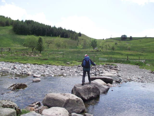 From here we had to drop down to Borrow Beck, to return down the valley bottom. I couldn’t remember how I had crossed the beck on what had been my second visit to these hills in the mid 1990’s, but there was no bridge marked on the map. When Chris asked how we were going to cross, I muttered something about carrying her across if necessary, but the day (and my face) was saved by the biggest stepping stones in the world.