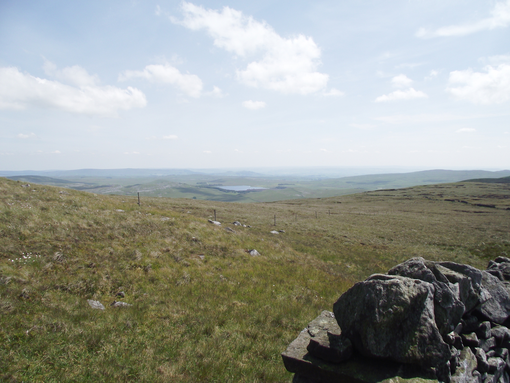 From the summit a track by a stone wall descends southwest, heading towards the main potholing area on Fountains Fell near Fornah Gill, with Gingling Hole and Magnetometer Pot being perhaps the best known. Not for us, though. Instead, we were heading southeast, first of all along the plateau then eventually descending to the Trig Point above Knowe Fell, giving views across to Malham Tarn in the distance.