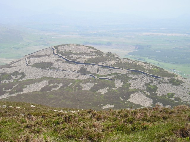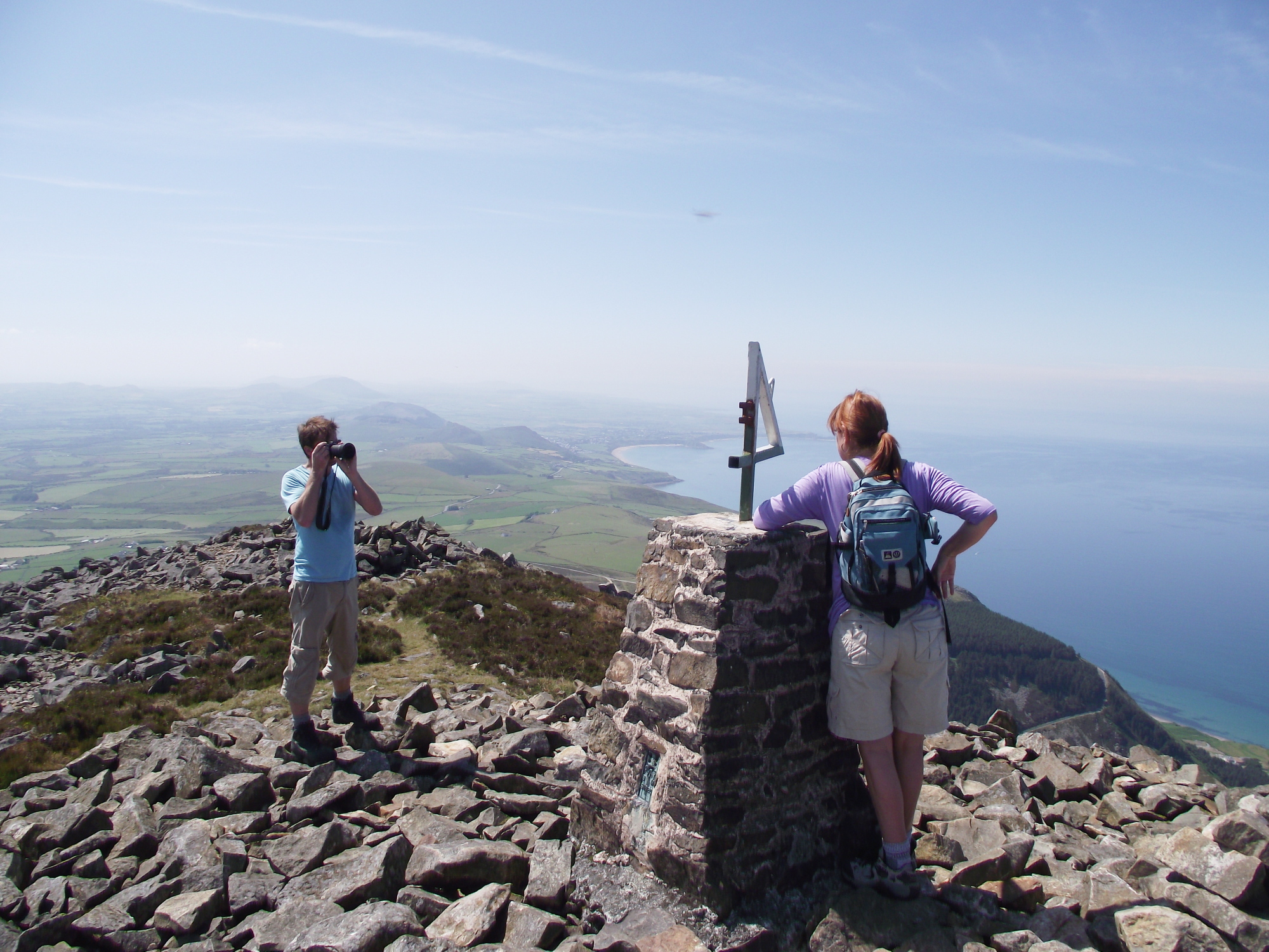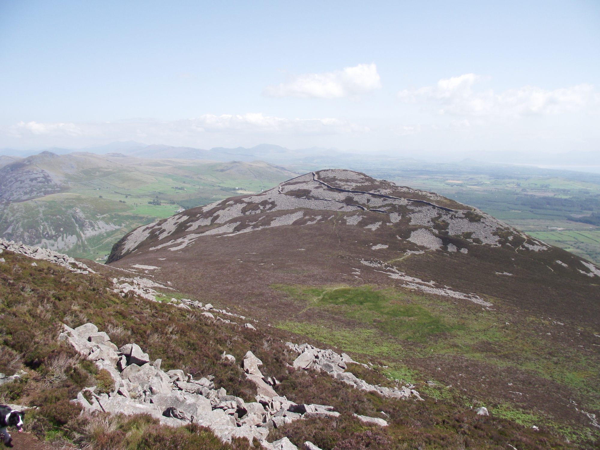 Next on the list was the ‘Centre Cairn’. We had to retrace our steps down to the bwlch, and from there is was a steady pull up to the summit of Garn Ganol, highest of the day at 564 metres. The views from the top are extensive, and include the Isle of Man, the Wicklow Mountains in Ireland, the Lake District and much of Snowdonia and Cardigan Bay. Not for us, though – last week the hill mist had restricted the views, today heat haze was the problem.