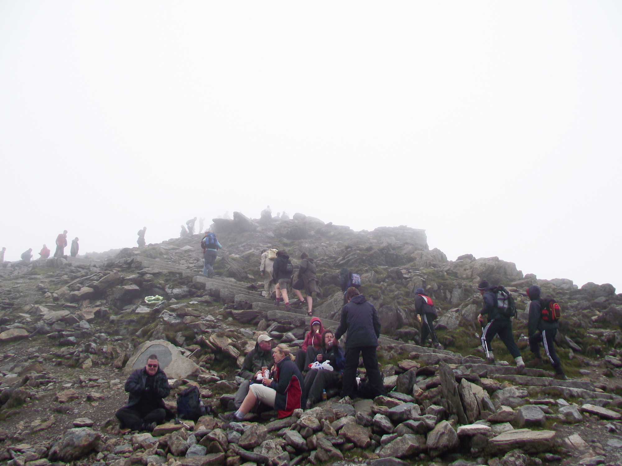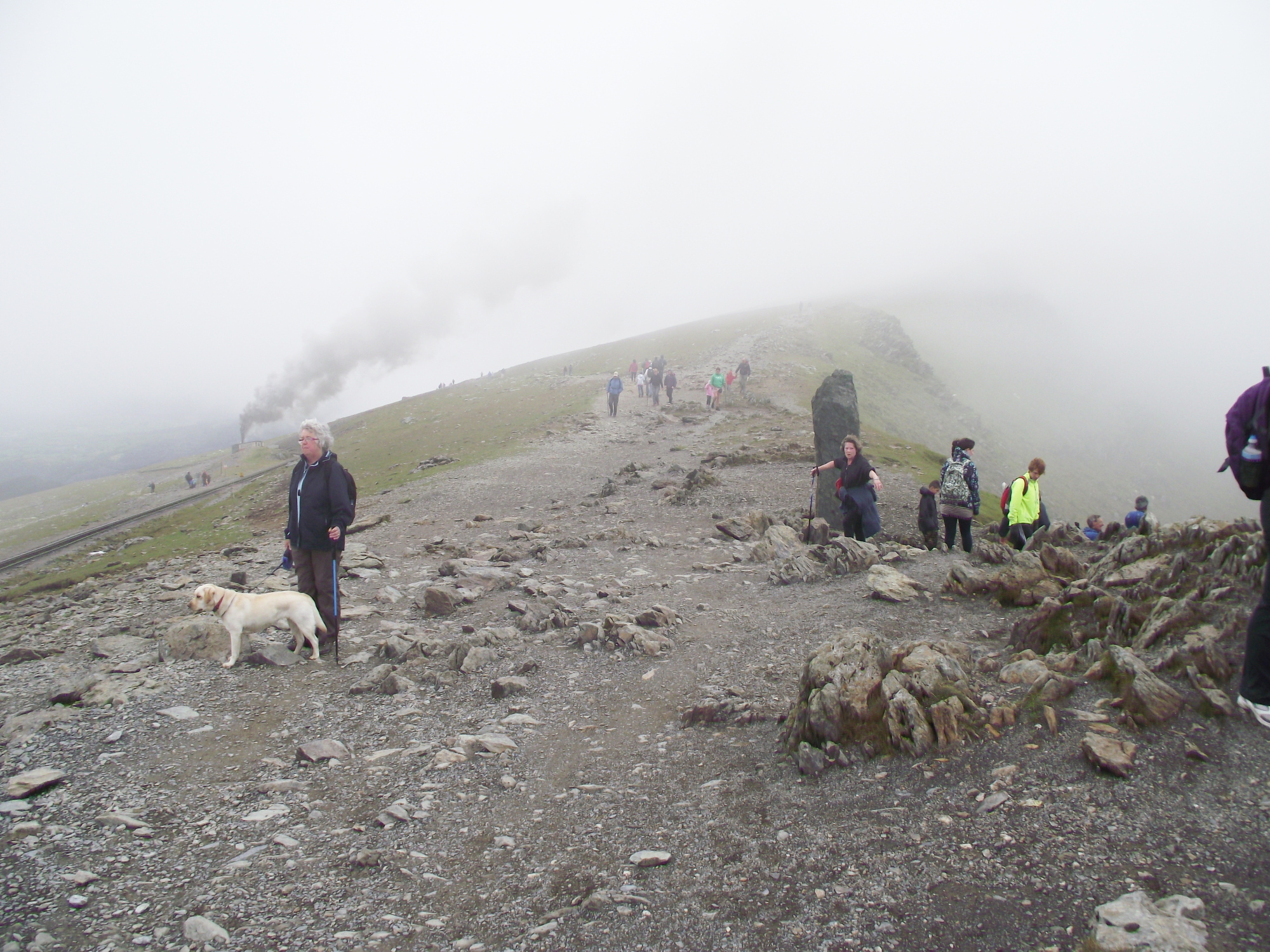 Beyond the bwlch we were still just below the cloud line, but as we went up the mist came down, until visibility was considerably reduced. I had originally suggested this route to Ian on the grounds that it was less busy than the popular routes on the east side. Despite this, it was busier than I have ever seen it, though nothing like as crowded as we found the summit of Yr Wyddfa.