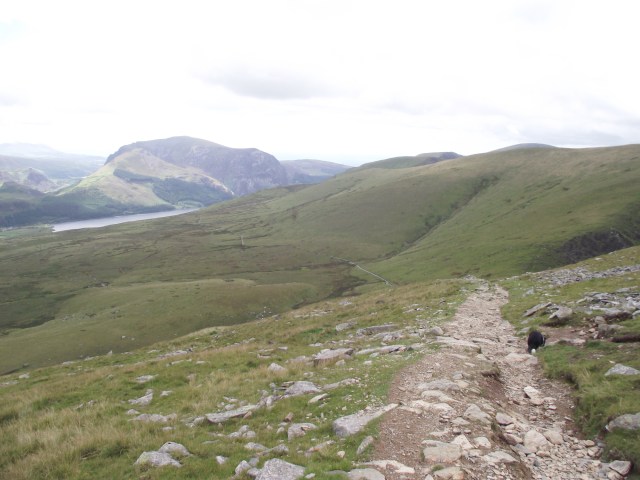 The route off the mountain stayed busy until the top of the zig-zags above the Miners Track, as this is where several routes come together. Descending to the right the PYG and Miners tracks were the busiest, ascending half right was the path to Garnedd Ugain on the Snowdon Horseshoe, and straight on several walkers were following the path by the railway, heading down to Llanberis.