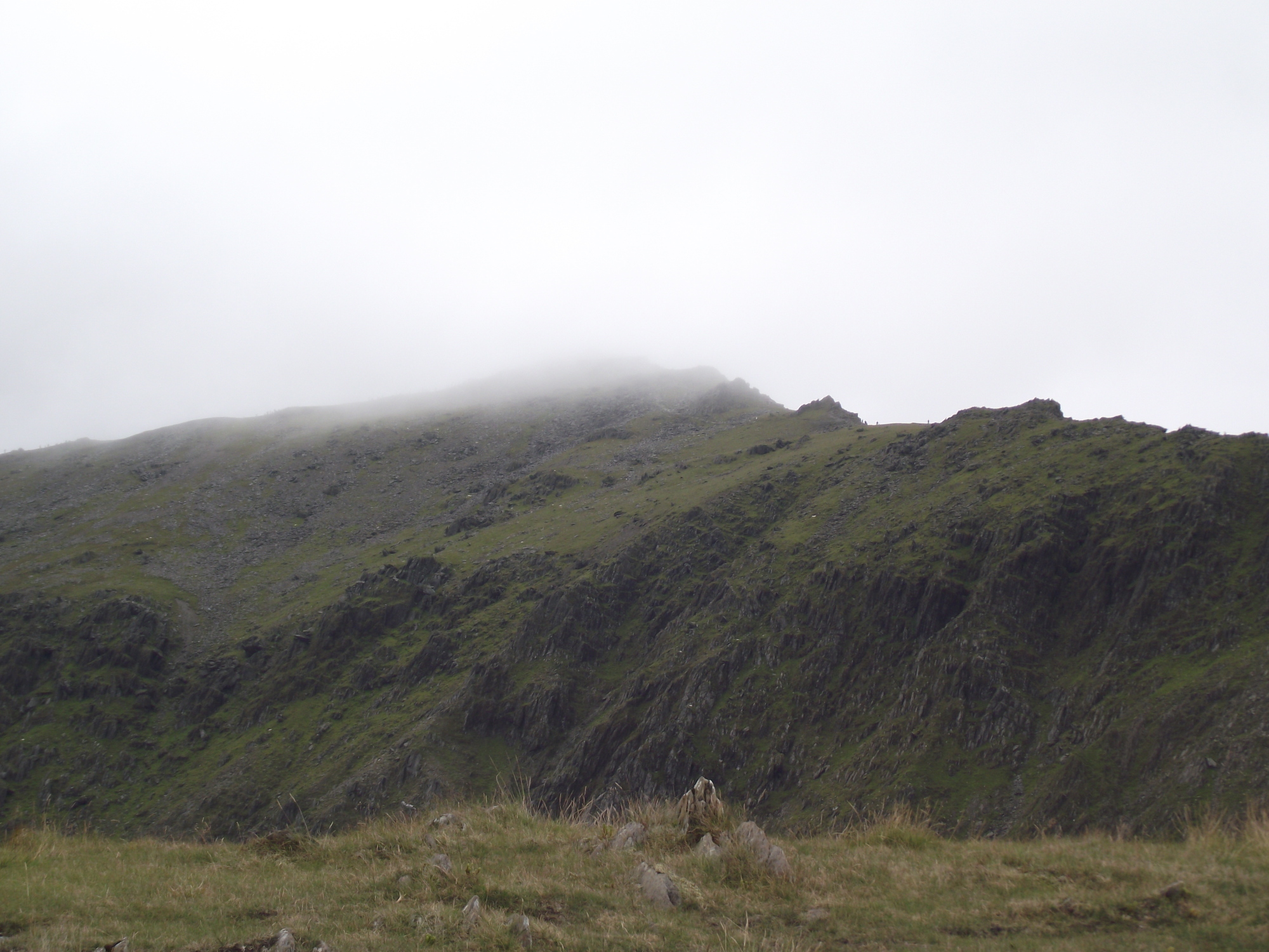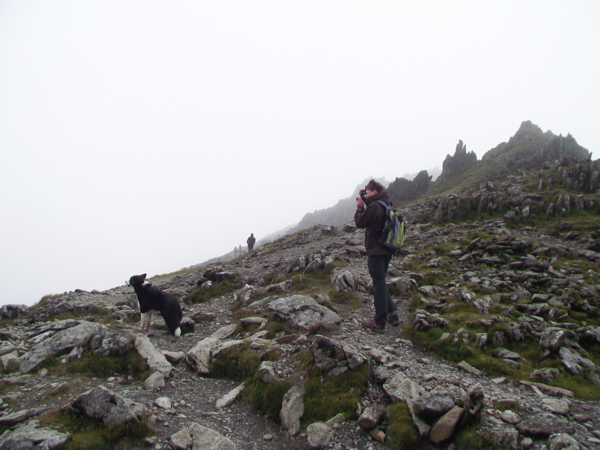 The trouble is, you can’t book the weather in advance, but the day we had picked was shaping up to be the best day in a wild, wet week. Best was a relative term, though. The day was overcast as we set off from Rhyd Ddu, and as we reached the top of precipitous cliffs of Llechog the mist was already creeping down onto the summit of Yr Wyddfa.