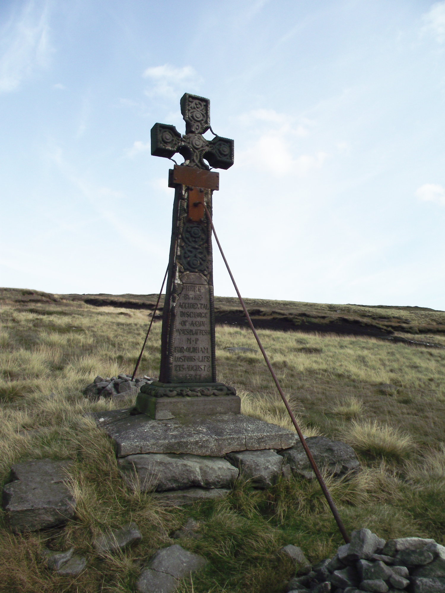 Although these hills lie just within the Peak District, it’s the edges that are remembered, rather than the peaks. Our route traced its way along the top of the Raven Stones Edge, followed by the Ashway Rocks, Dean Rocks and the Great Dove Stone Rocks. On the way we passed two memorials, both quite visible from the valley bottom. The first is an iron cross dedicated to James Platt, a local MP killed in a shooting accident in 1877. The second memorial is a cairn perched on a small gritstone outcrop above the Great Dove Stones, commemorating Brian Toase and Tom Morton, killed in a climbing accident in the Dolomites in 1972.