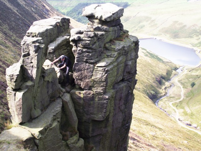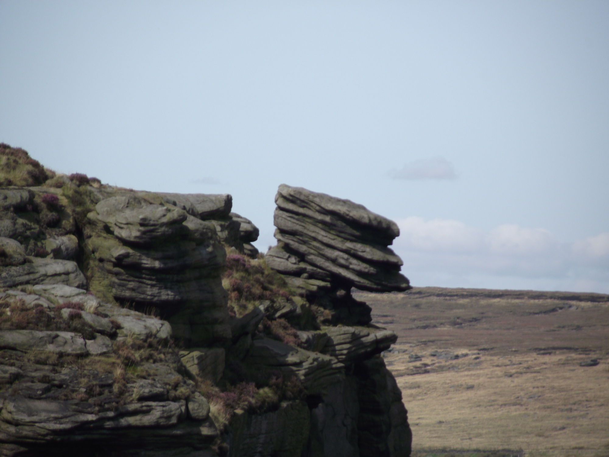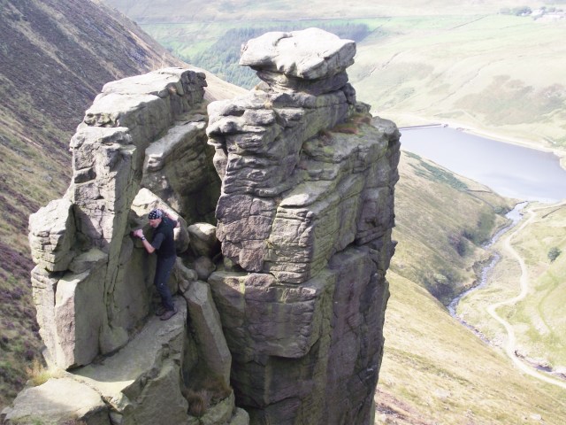 From the clough, a narrow path led up to the Hanging Stone, marking the beginning of the top of the Raven Stones. The Hanging Stone does just that, balanced above the valley below, defying gravity as it probably has for many years. Just beyond there we arrived at the aptly named “Trinnacle”, a three headed pinnacle perched high above Greenfield Brook. It provides a great place for a lunch stop, or just ‘mucking around’.