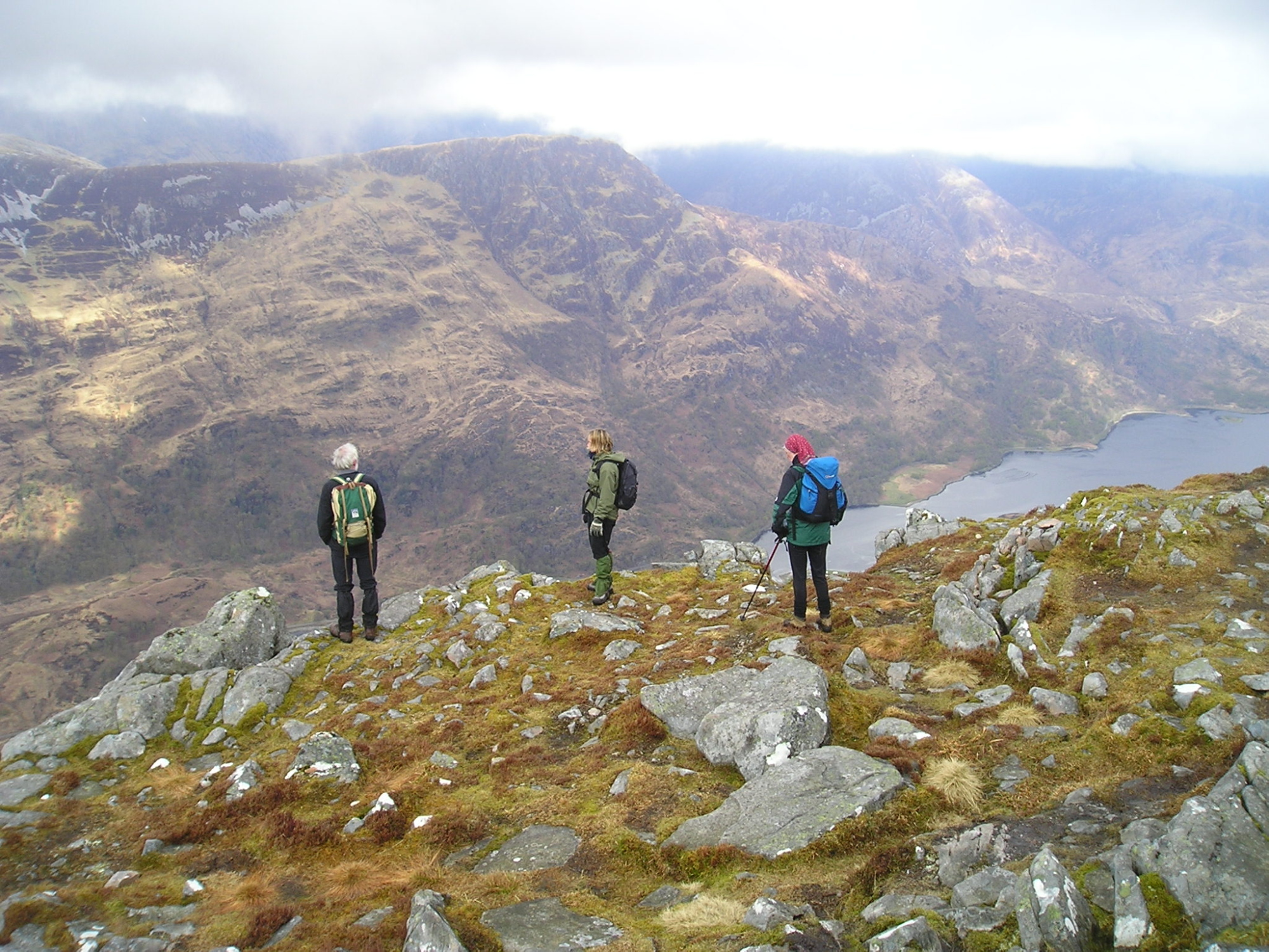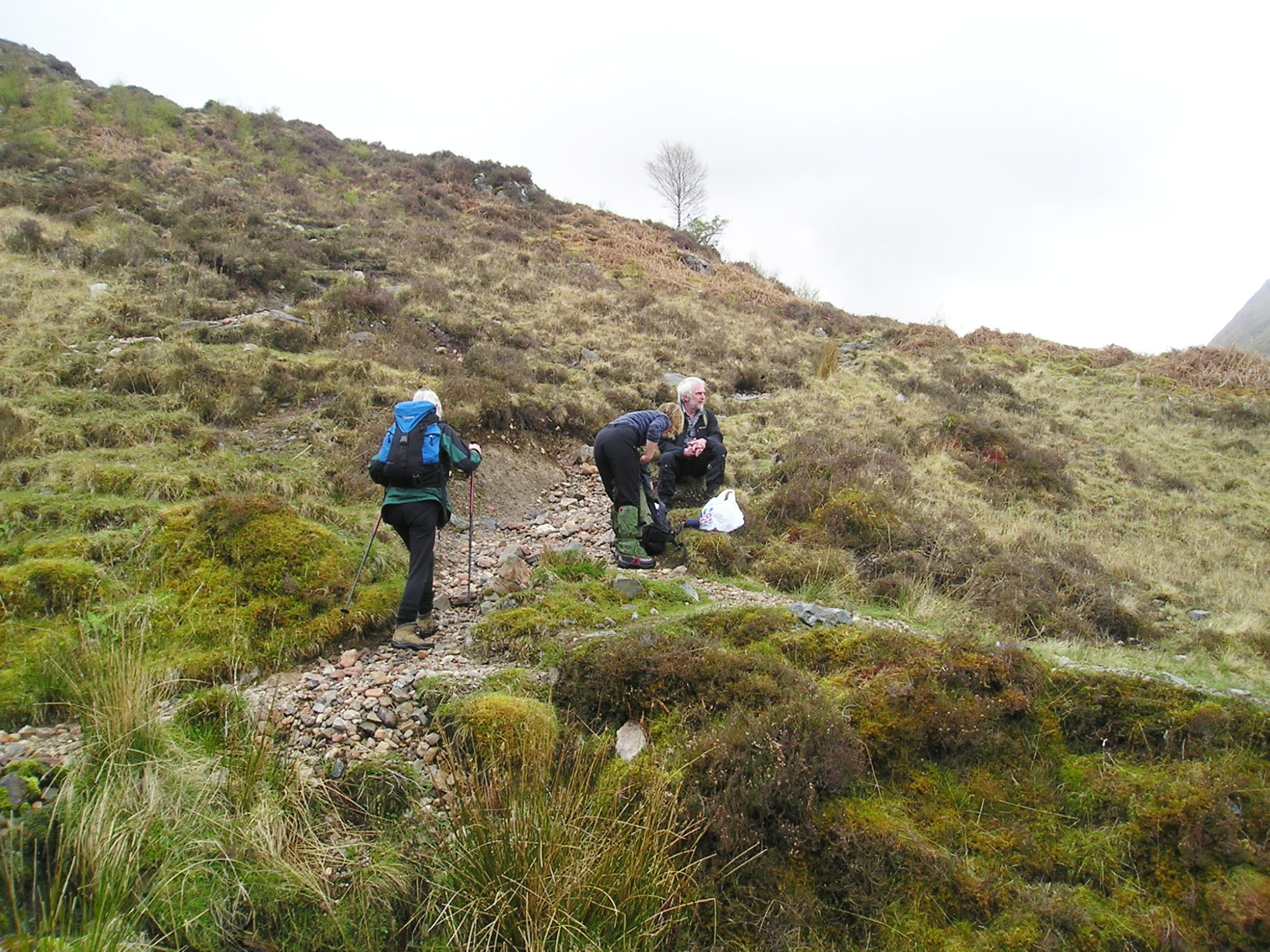 The summit is rounded, and much bigger than the views from Ballachulish might have suggested.  For many, the way up is also the way down, but on our trip we located a narrow path descending to the west.  This gets steep in places, but never in a life threatening way!  As well as bringing in a bit of variety, the views down to Glencoe Village and Loch Leven are constantly changing,  It’s good, though, when the descent finally starts to level out towards the footbridge near the start.