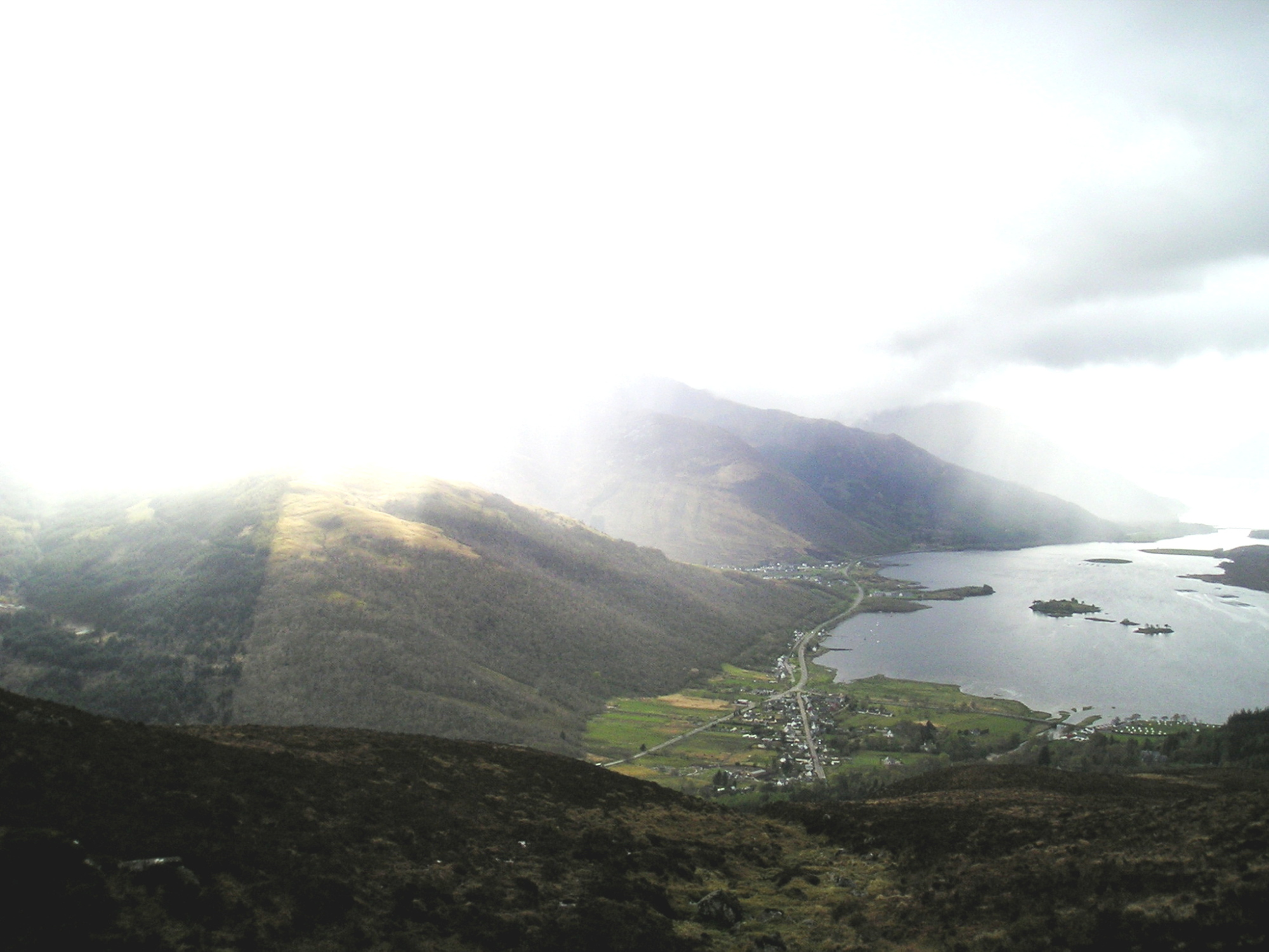 Looking down to Glencoe village, with the top of Am Meall to the left in the mist