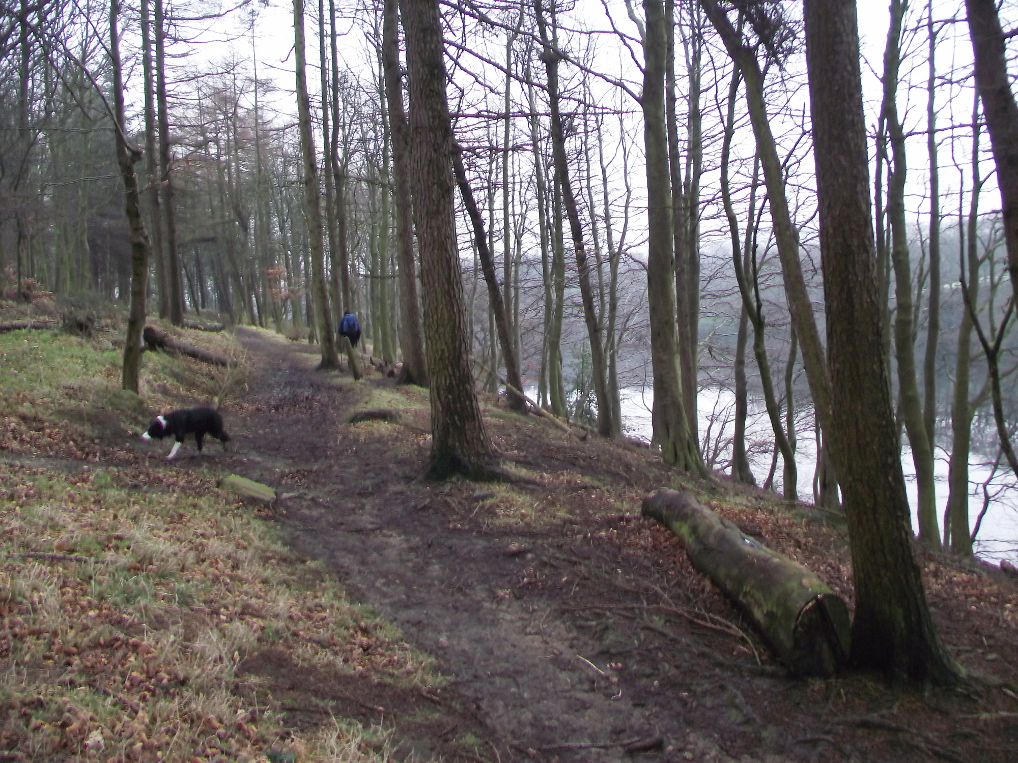 Our route took us in a loop just below the edge of Rishworth Moor, taking in the inappropriately named (in the conditions) Warm Withens Hill.  From there another drainage ditch headed down towards Ryburn Reservoir – after the empty, snow-covered moor it was quite a contrast to be back amongst stone walls and pylons.  From there we took the path through the woods at Ryburn Reservoir, looking more like a Scottish Loch in the winter conditions