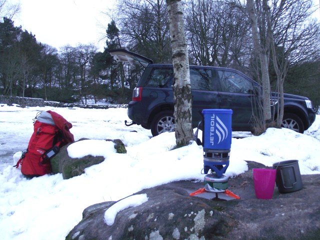 We slithered on, back down the Duke’s Drive to the car park – although the Grivel Spiders have previously given good service, the Kahtoolas were a total success and I’ve already put in an order for a second set. The other bit of ‘kit’ I’ve started carrying recently is a Jetboil stove – it’s amazingly fast, and weighs about the same as a flask. Hot chocolate at the end of the walk never tasted better!