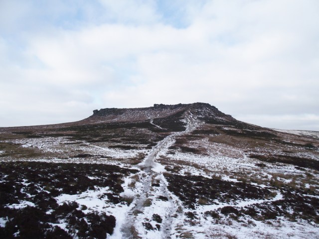 Although it only rises to just above 370 metres, Carl Wark dominates the approach from Burbage Bridge to the south. Once thought to be an Iron Age fort, it has now been suggested that there may be older links to the Bronze Age or earlier. The existing natural cliffs and boulders have been reinforced by gritstone blocks, making a wall over two metres high, and although it was probably not permanently occupied, it would have provided a stronghold in time of danger. The unusual name may be Old Norse, meaning The Old Man’s Fort, the Old Man in this case being the Devil! Carl Wark must have looked ancient and mysterious even to the Danes.
