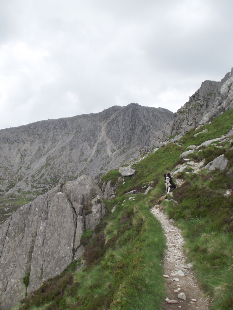 In pretty quick time we had finished the terrace route, and were heading down to the easy pass of ‘Bwlch Tryfan’, with the impressive scramble route of ‘Bristly Ridge’ beyond. However, a Grade 1 Scramble isn’t really the place for a dog, not even a Border Collie, so we settled for lunch instead before heading back.