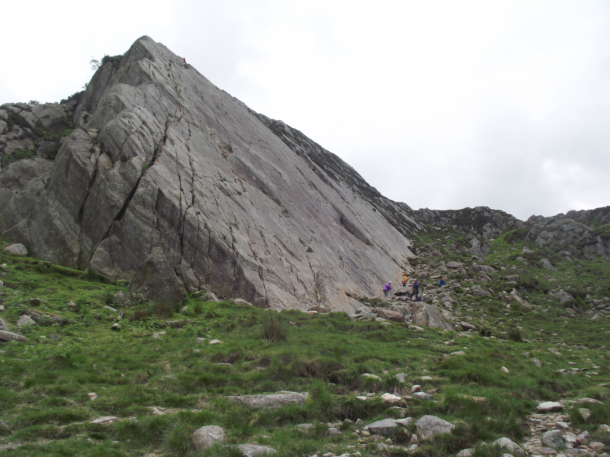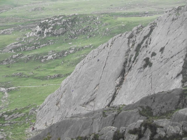 My route took me past the small climber’s crag of ‘Tryfan Bach’. The last time I had been on the crag was many years earlier, when I went down instead of up, guiding a rescue stretcher on a training session with the RAF. As I passed today, two climbers were making rapid progress on one of the easier climbs, but I was more interested in picking the best line to ‘Heather Terrace’.