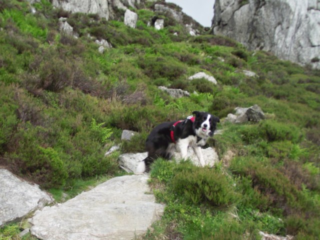 I wasn’t alone today – Border Collie ‘Mist’ was also along for a high mountain day. I have to confess that I’m not as blasé as I used to be about taking a dog on potentially serious mountain terrain – 25 years ago my Mountain Rescue dog ‘Matt’ would go anywhere that I did, but although ‘Mist’ is used to long mountain days, I had never taken her on a route with big drops below! Time to use the ‘Web Master Harness’ featured in post #56.