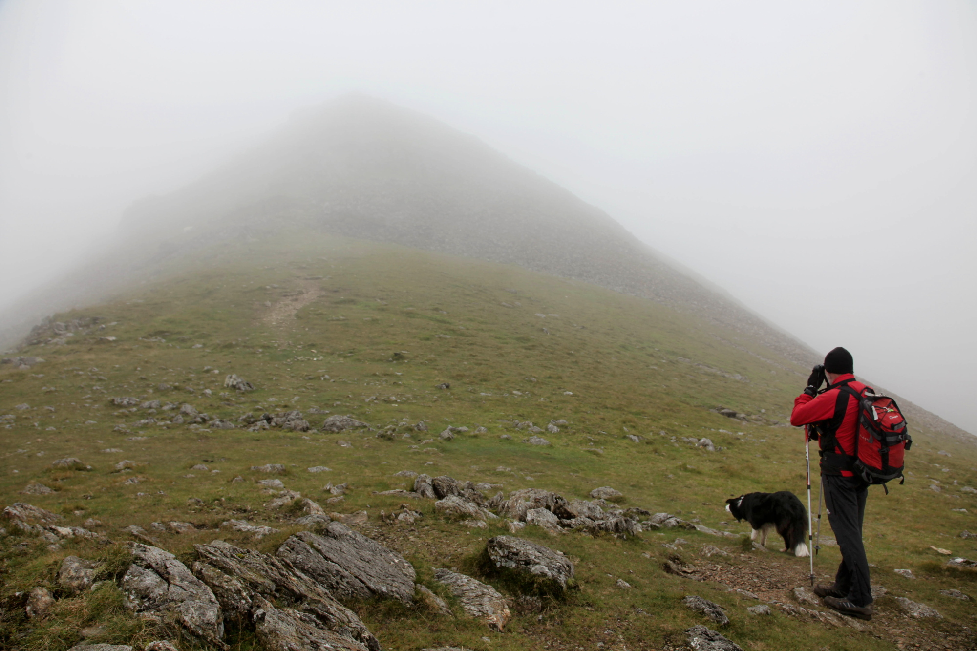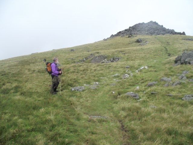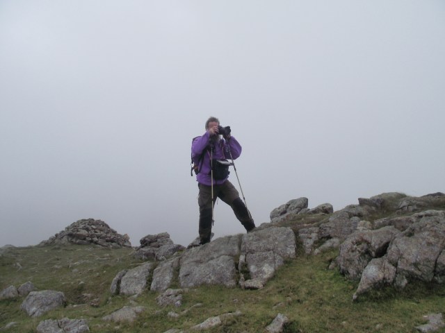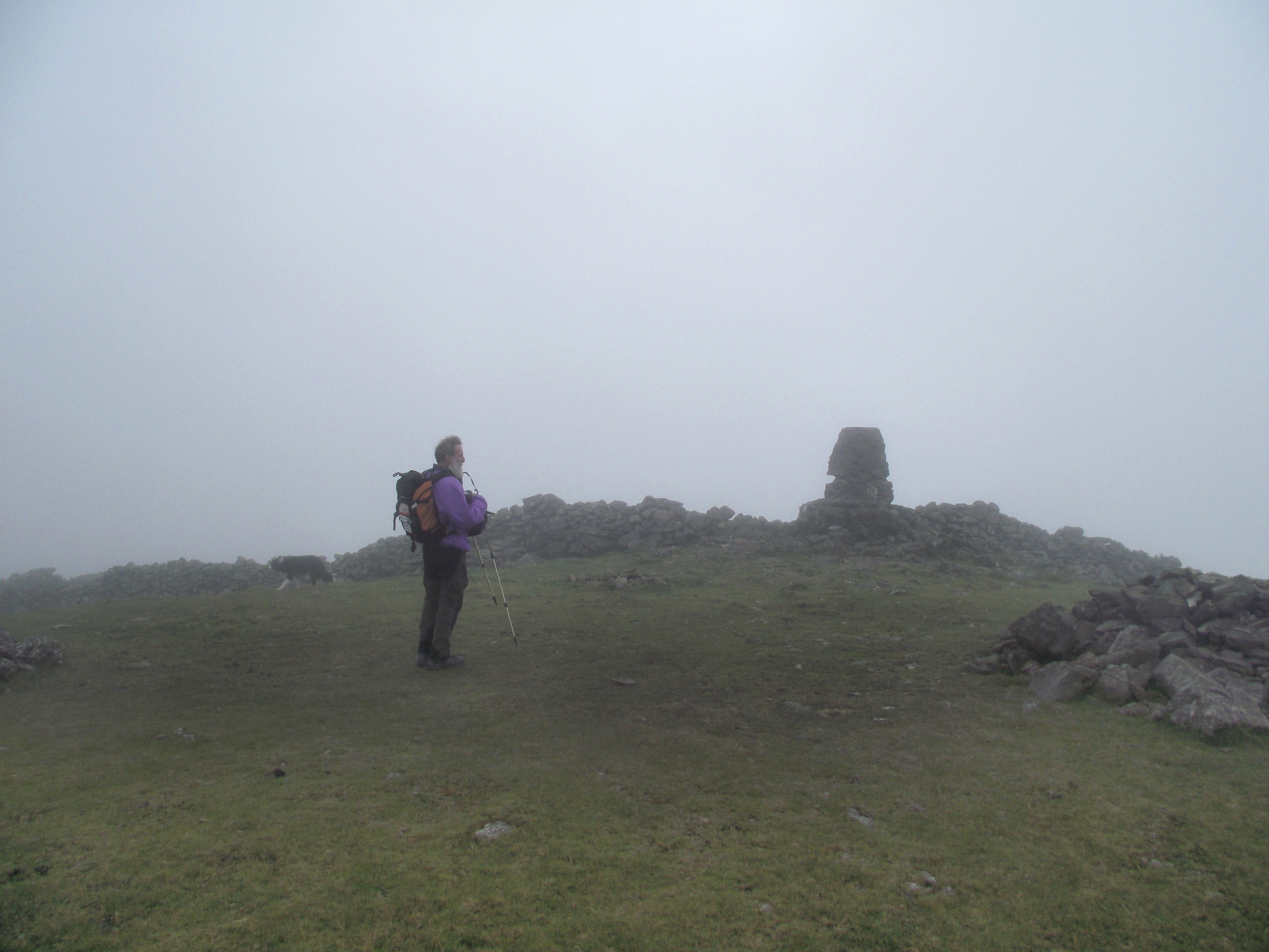 Towards the summit we ran into the mist that wasn’t supposed to be there, though the steeper ground was a good indication that we were getting near the top. The summit was indicated by a battered Ordnance Survey Trig Point, but the continuation of the ridge to the north was just different shades of grey until we eventually emerged from the cloud.