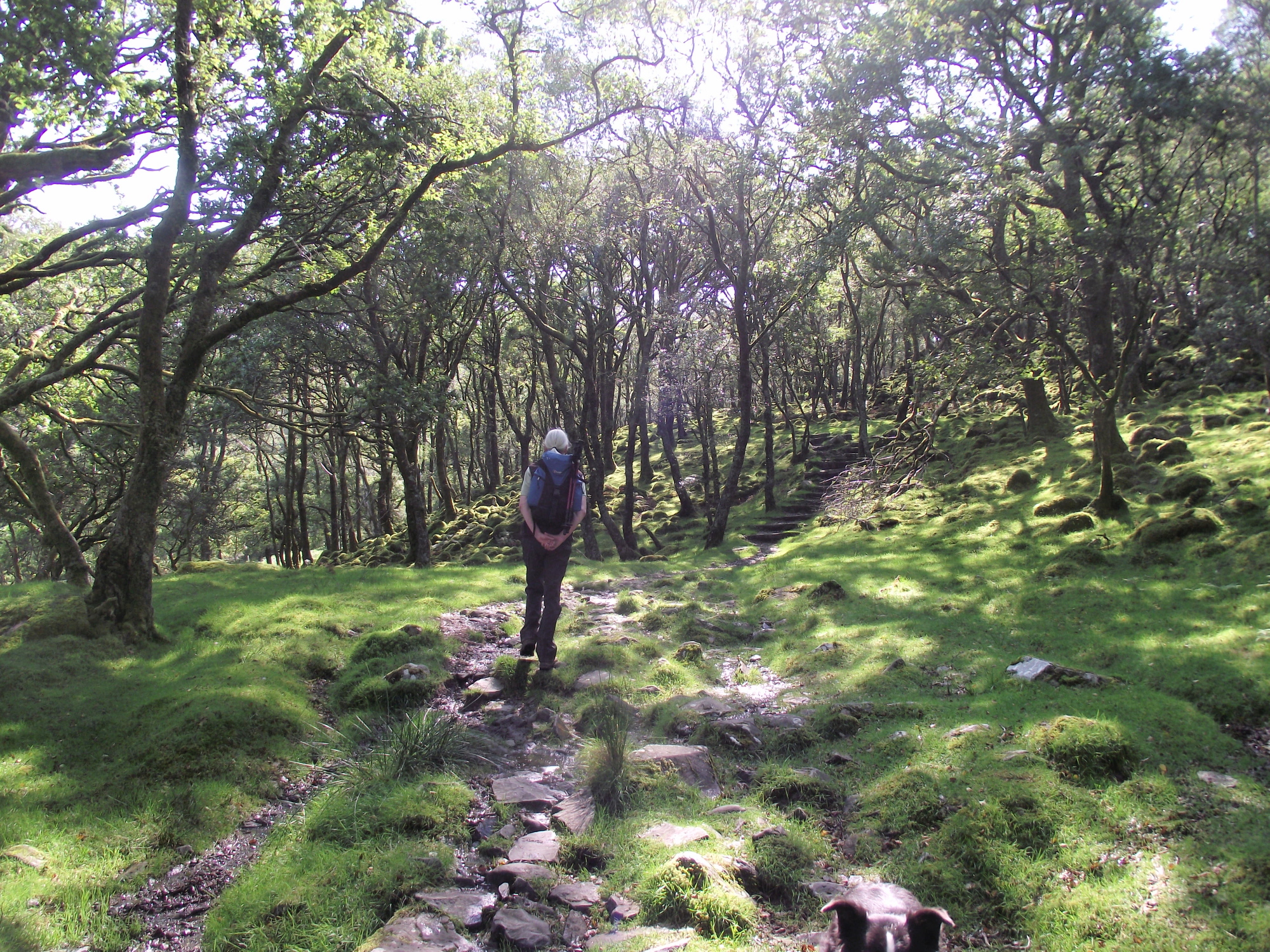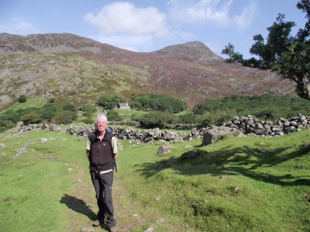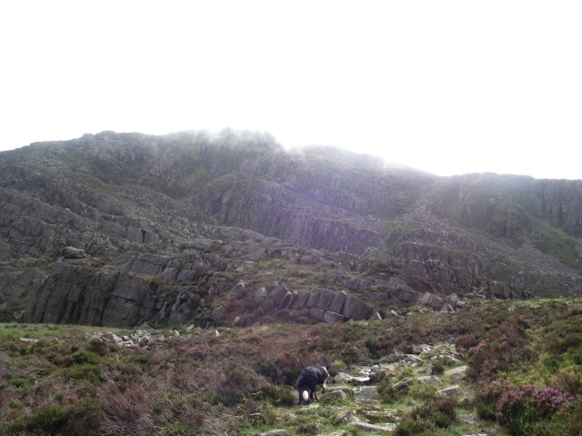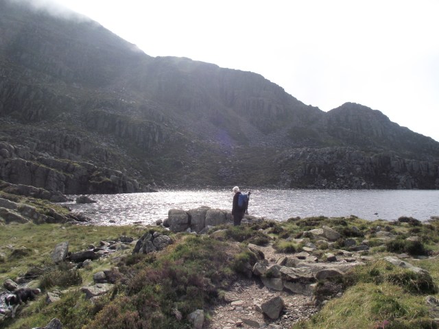 ‘Mist’ and I were back with Chris in less than an hour, which was long enough for ‘T-shirt’ weather to change to ‘fleece mid-layer’.  Having claimed the ‘Big Rhinog’ we bailed out to return by the same route.  If the weather became gloomy, the mood was lightened by meeting John (aged 78) and his son-in-law Raish, who walked down the Cwm Bychan with us.  If I’m still walking the hills at 78, that will give me plenty of opportunities to re-visit this lovely area.