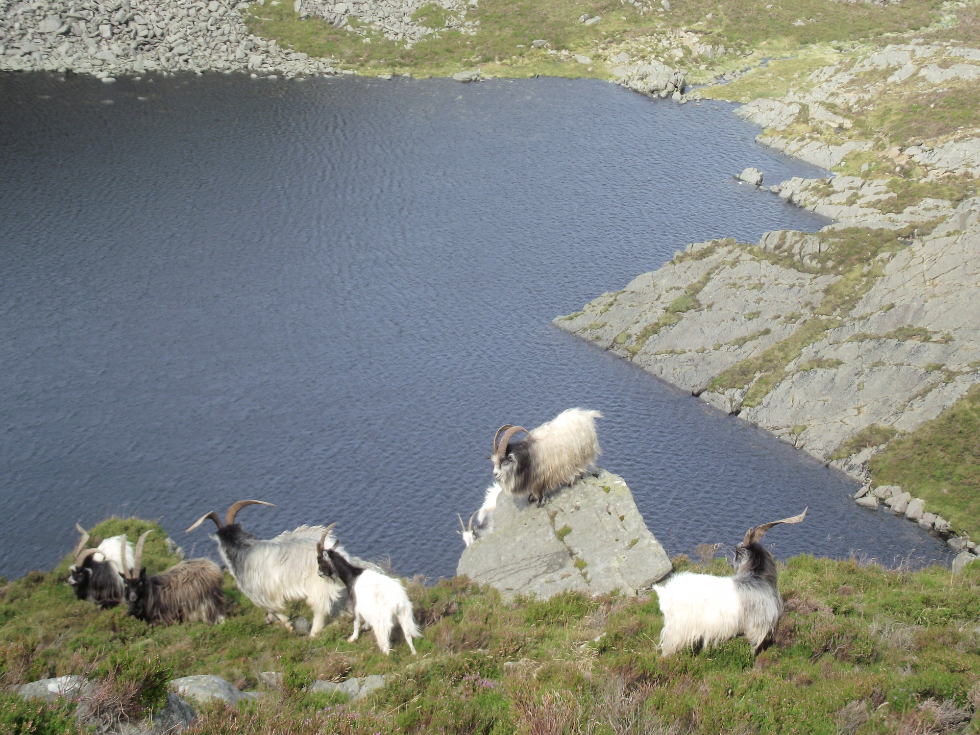 Having reached Llyn Du, Chris decided to admire the scenery from the lake, leaving me to make a super-fast dash to the summit and back.  There was little doubt over our Border Collie’s intentions – ‘Mist’ was also going to the top.  On the way we passed a herd of about twenty wild goats, indifferent to man and dog charging up and down their mountain.  The summit Trig Point had an orienteering marker attached – apparently others also enjoy dashing up and down Rhinog Fawr.