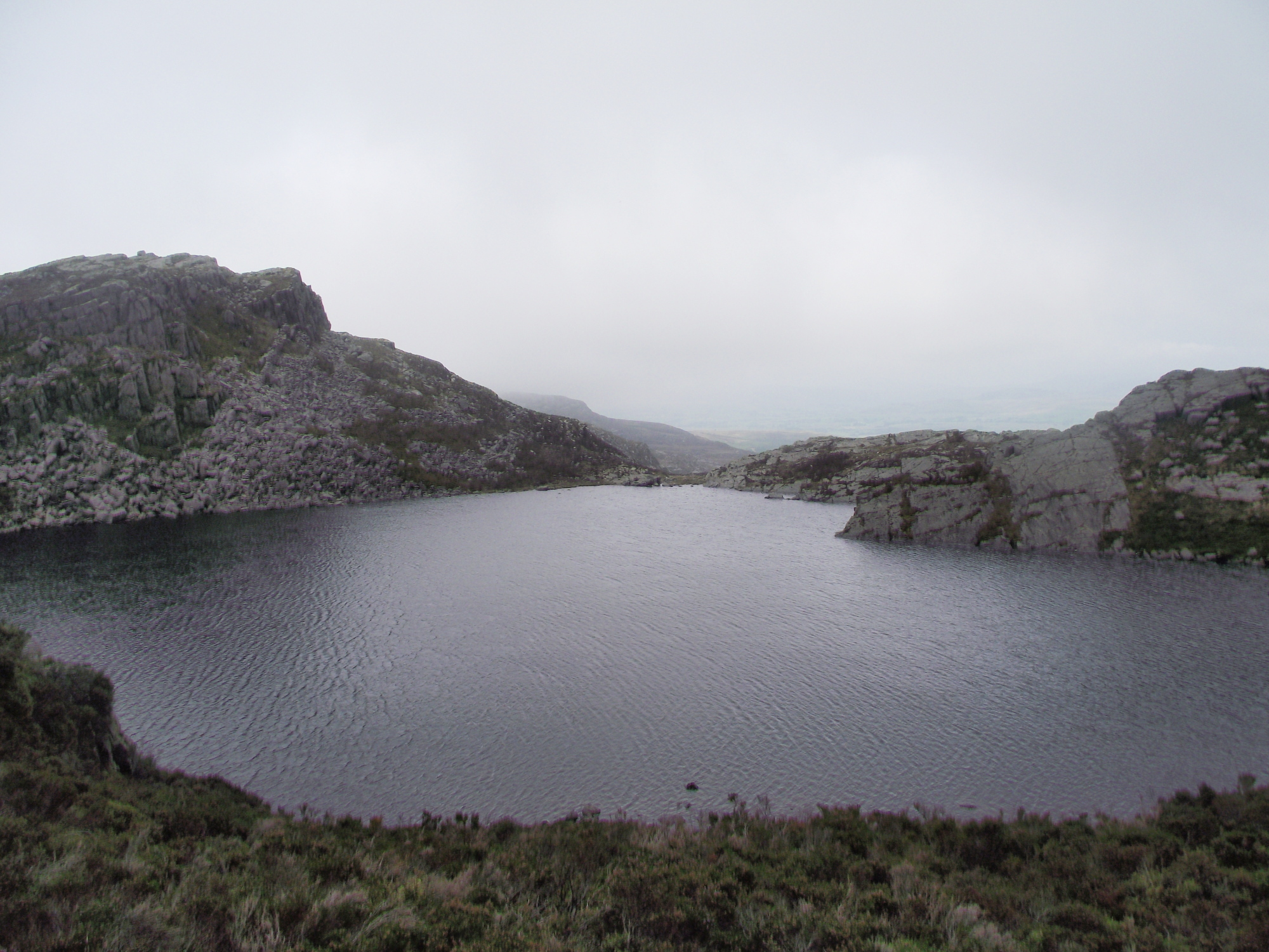 In this case, the getting tougher bit was relative – the ground we had to cross looked rough, but a narrow, well-walked path cut through the heather and boulders, taking us to the isolated and beautiful Llyn Du (‘Black Lake’).  If we were pleasantly surprised by the easy progress on the path, we were somewhat dismayed to see the mist closing in on Rhinog Fawr.