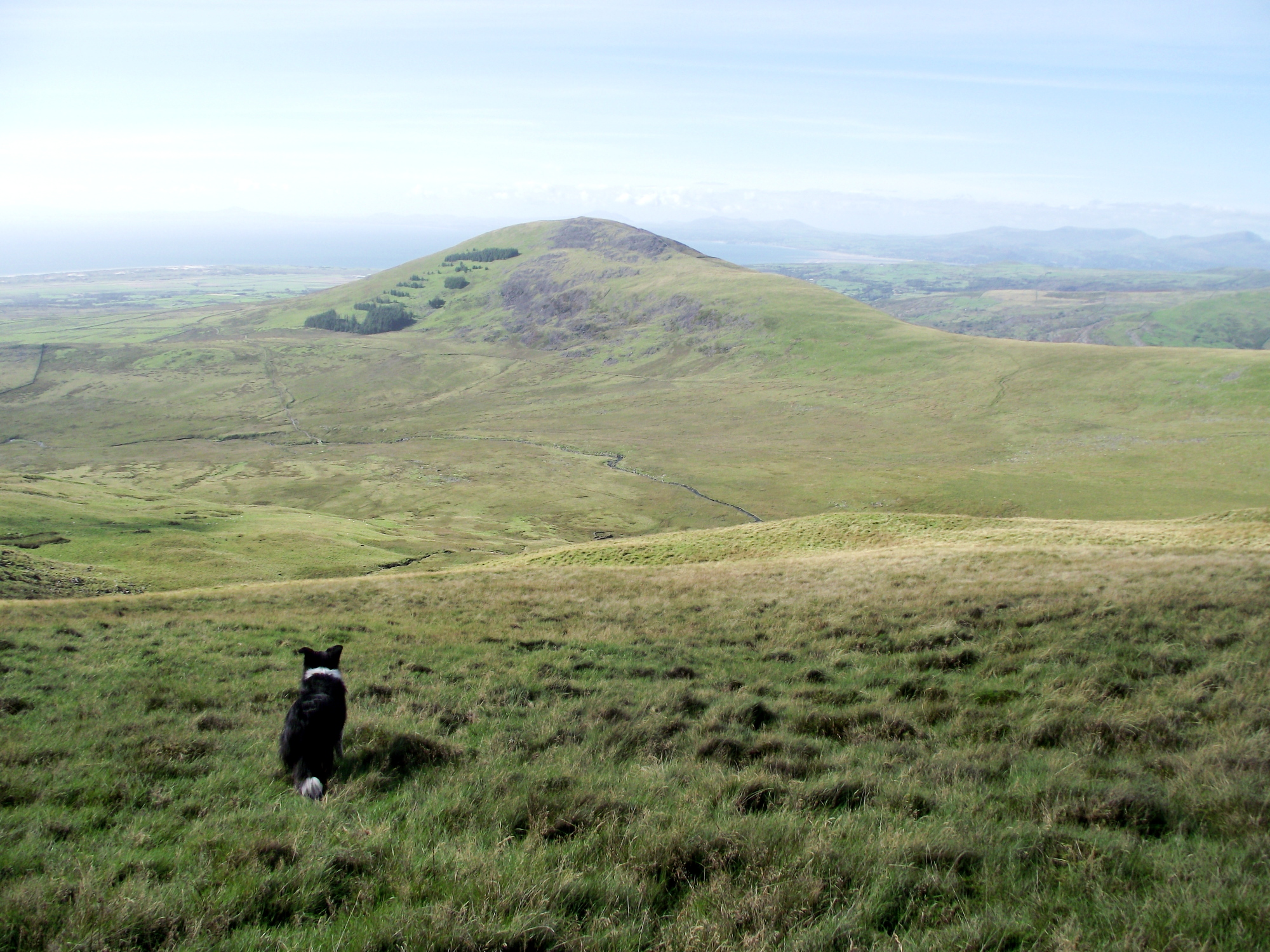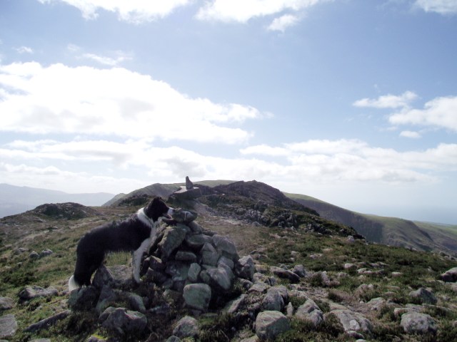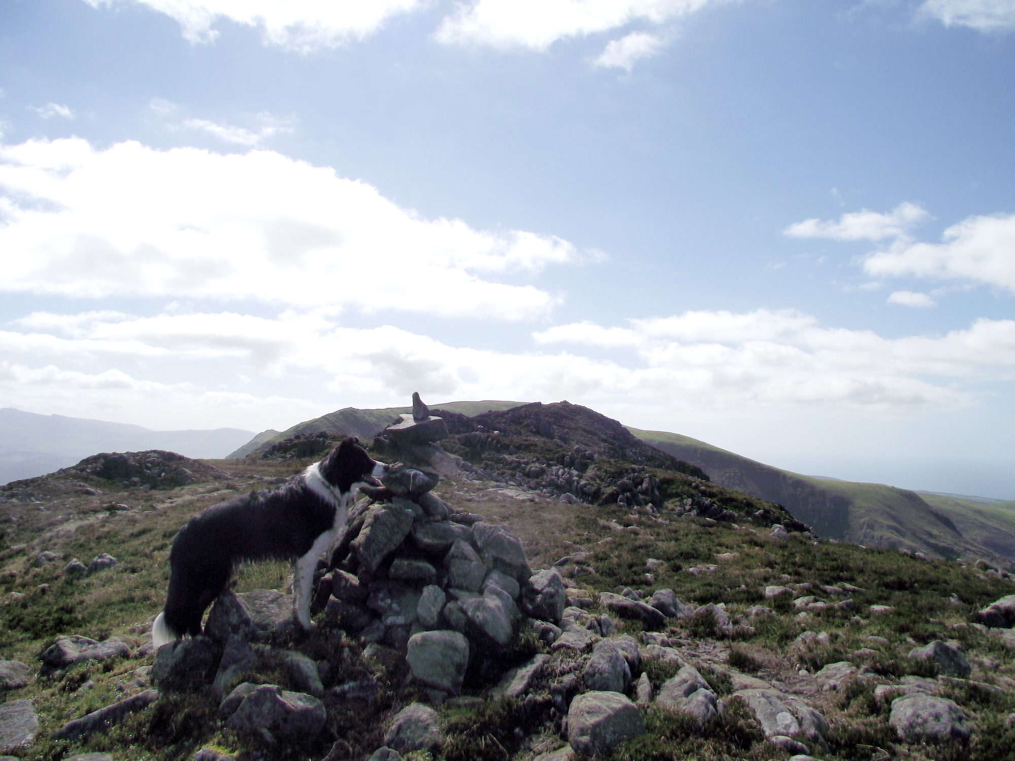 If the ascent had been steep and stony, then so was the descent to the col next to the small lake of Llyn Hywel. The height lost had now to be regained to the summit of Y Llethr, the highest peak in the Rhinog Mountains. From here there was a complete change of atmosphere with steep, rocky slopes replaced by rolling grassy ridges. Easy walking demolished the remaining distance, and apart from Border Collie ‘Mist’ and a couple of wild goats, the soaring grass ridge was all mine.