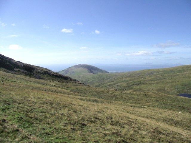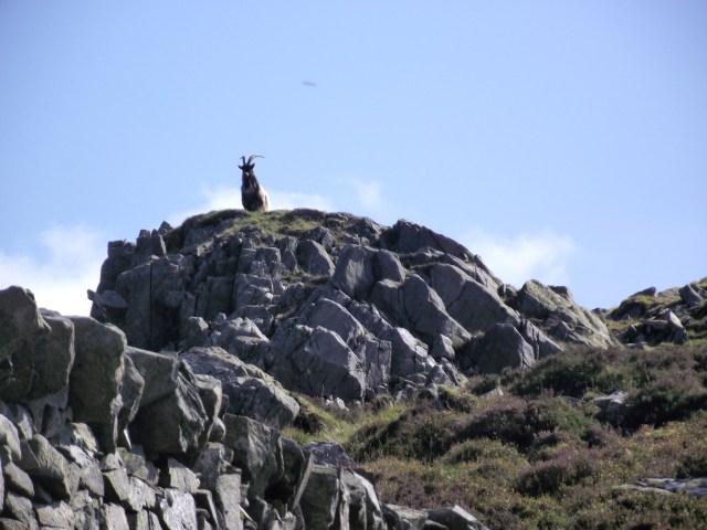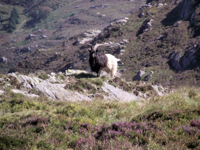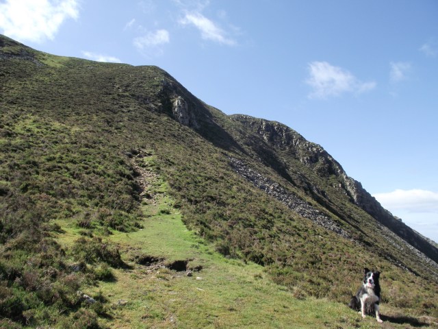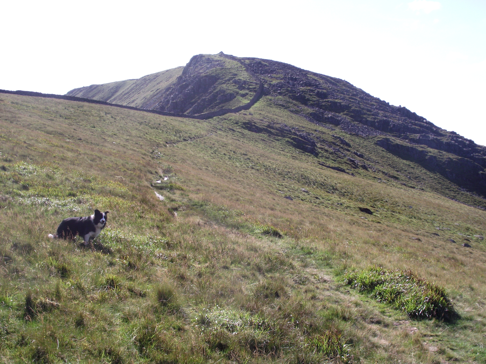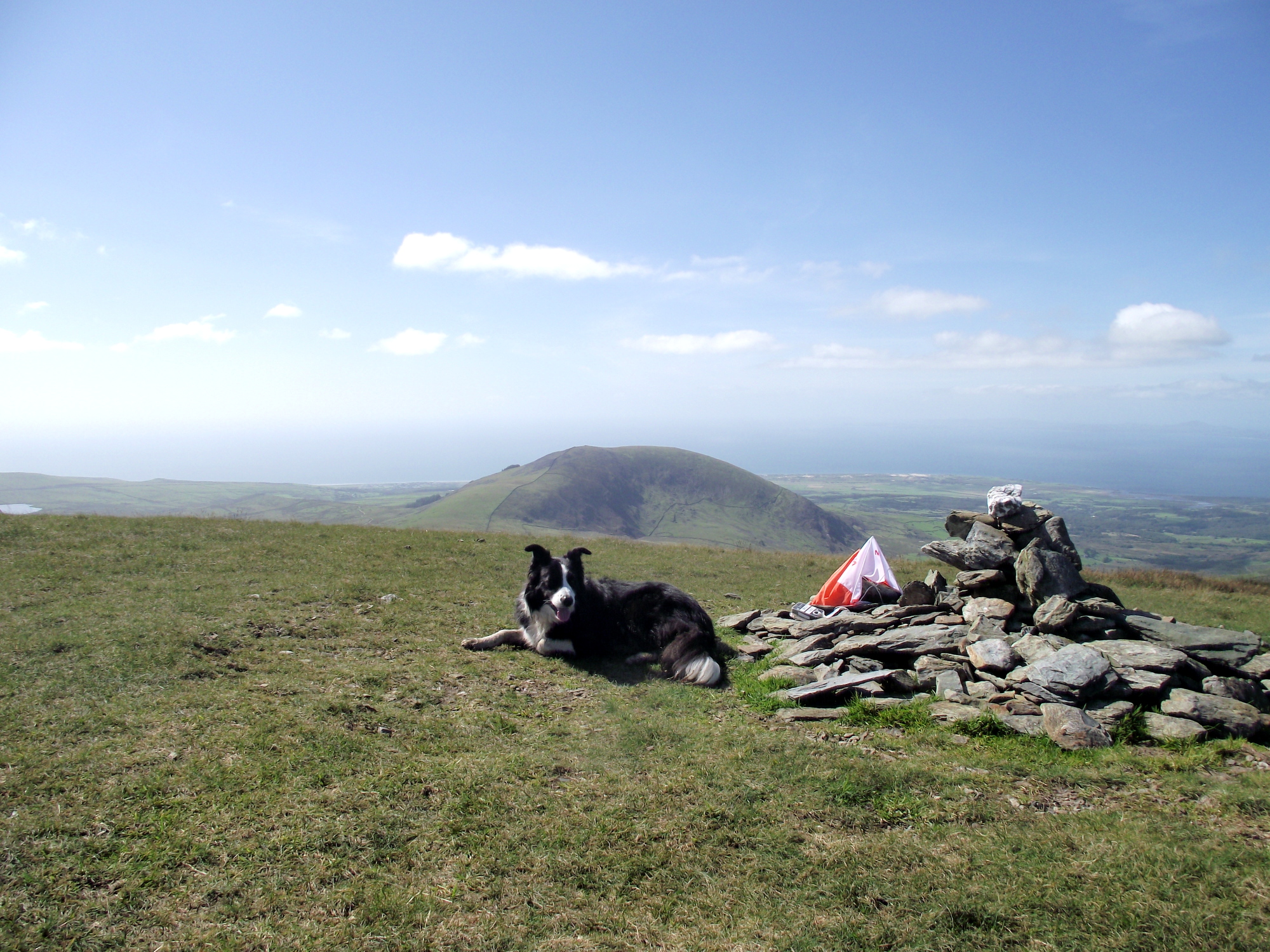 If the ascent had been steep and stony, then so was the descent to the col next to the small lake of Llyn Hywel. The height lost had now to be regained to the summit of Y Llethr, the highest peak in the Rhinog Mountains. From here there was a complete change of atmosphere with steep, rocky slopes replaced by rolling grassy ridges. Easy walking demolished the remaining distance, and apart from Border Collie ‘Mist’ and a couple of wild goats, the soaring grass ridge was all mine.