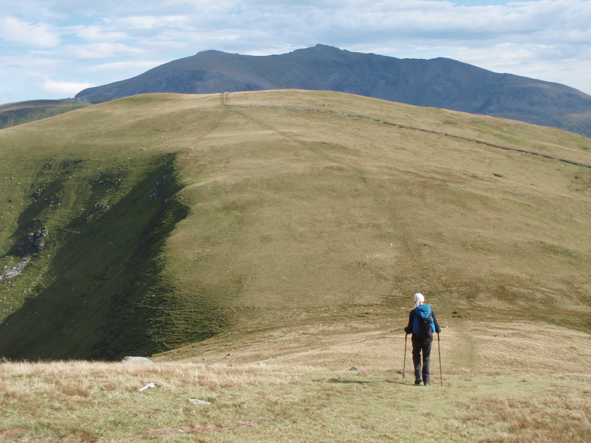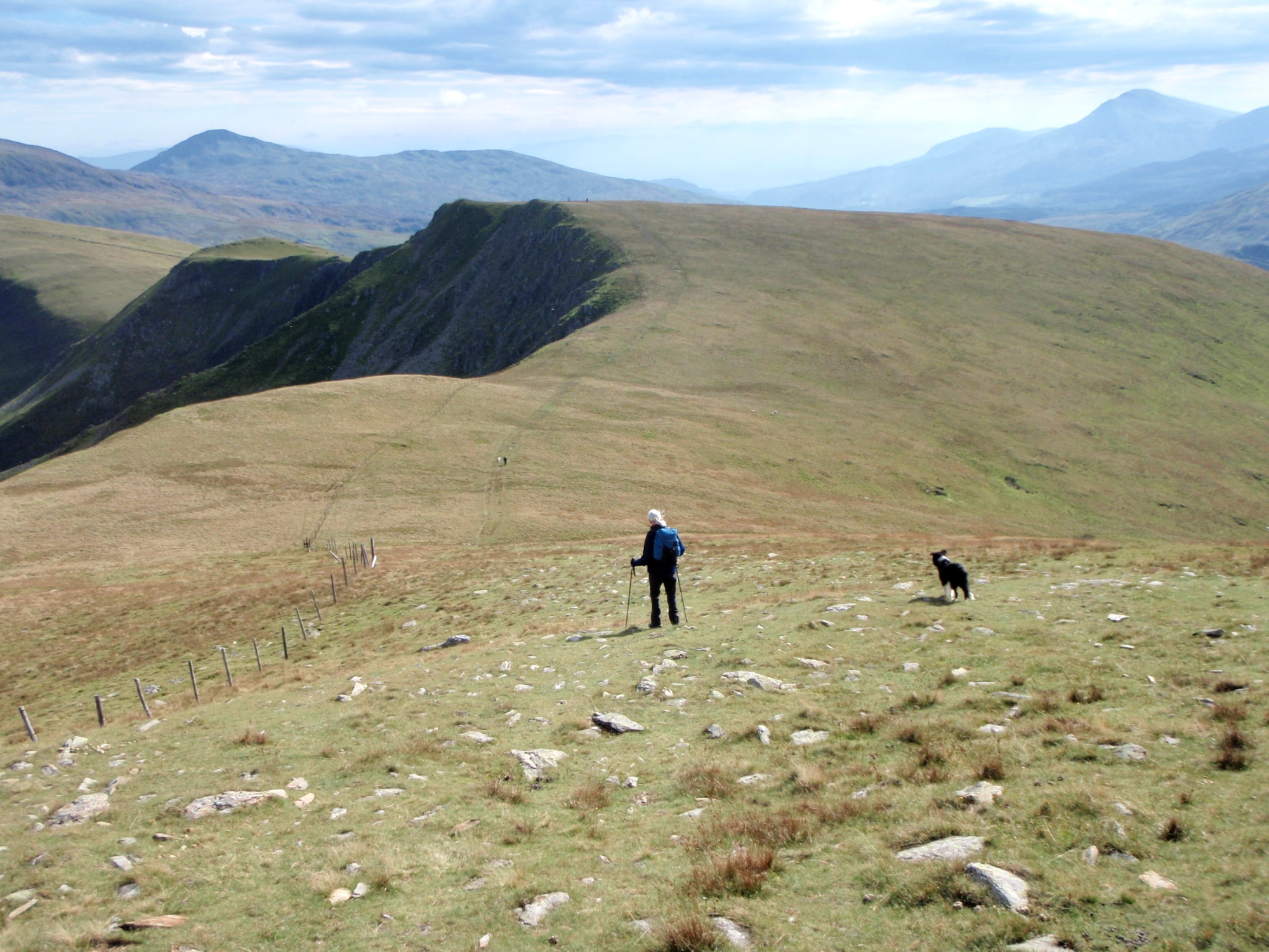 If the views are easy on the eye, the walking is easy on the legs, with a broad grassy switchback of a ridge leading off south. The crowded summit of Yr Wyddfa (Snowdon) is about 6 kms (3¾ miles) away in a straight line, but these hills are comparatively deserted. The easy terrain underfoot makes for fast progress, and the ridge is very popular with hill-runners.