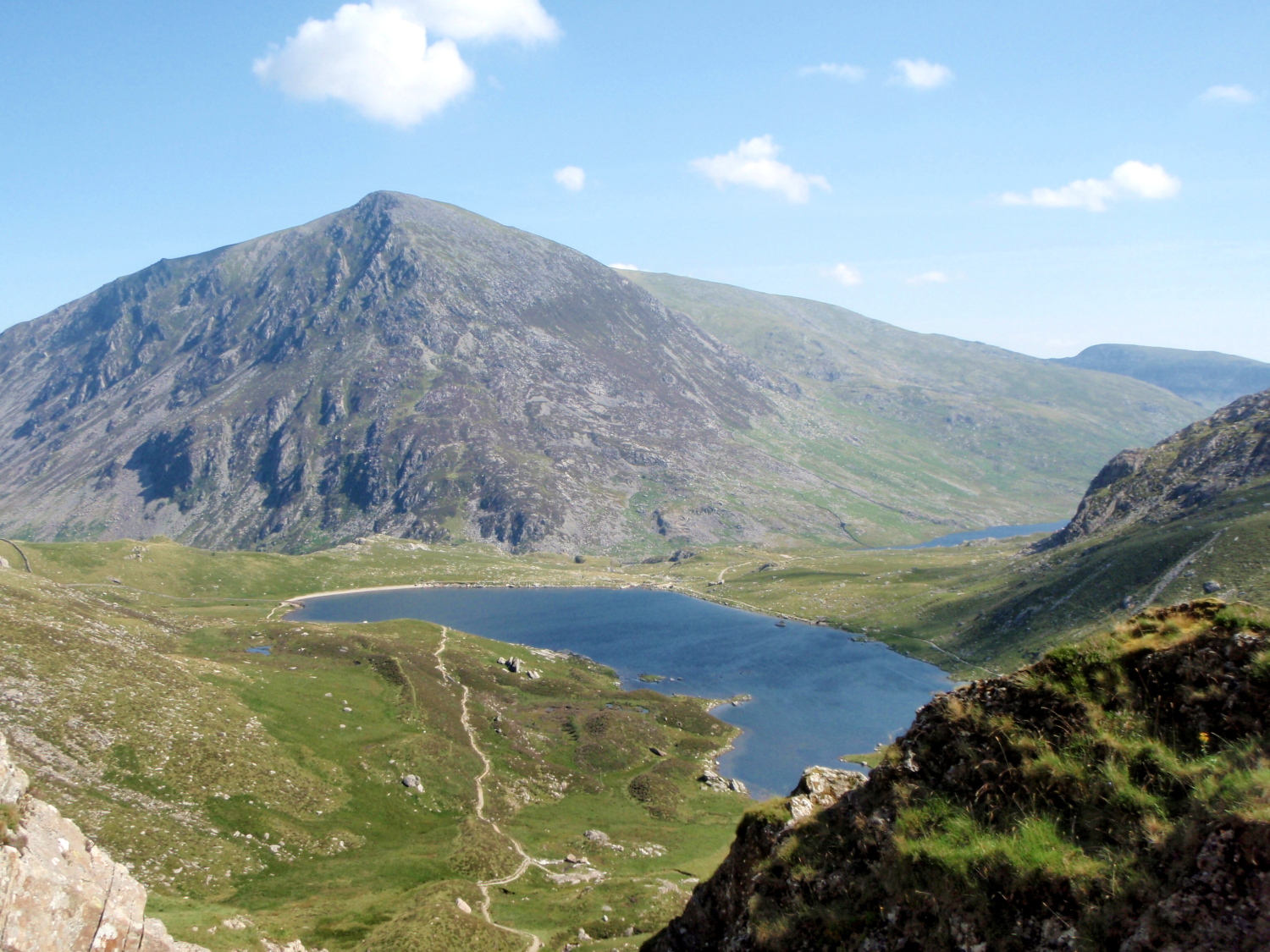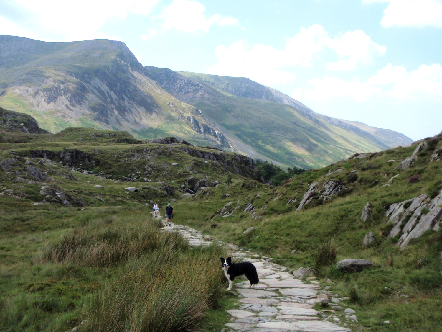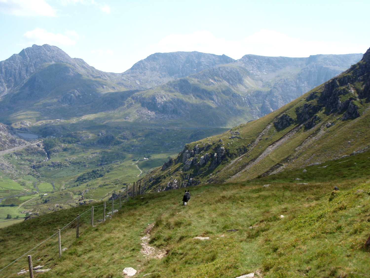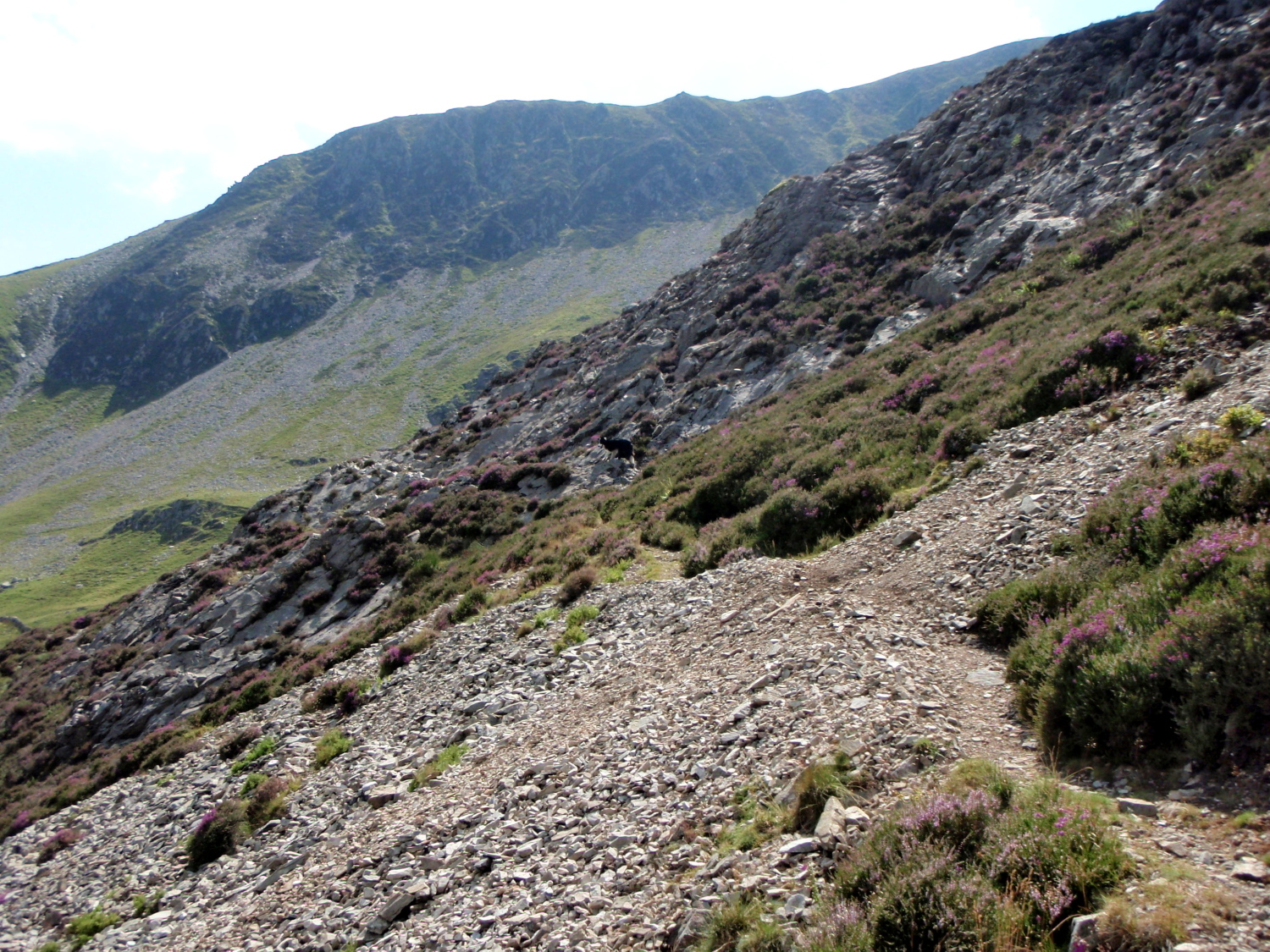 From Cwm Bual the high level path was easy to find and to follow, though lack of wear suggests that not many come this way. In places it was little more than a sheep track, and at times there were some nicely airy views down to Nant Ffrancon below. Before long I had picked up the worn path coming off the Northeast Ridge of Y Garn, leading the dog and I down to the shoreline of Llyn Idwal, where the warm weather had tempted several swimmers into the lake – the dog declined the offer of a swim, but settled for a paddle instead.