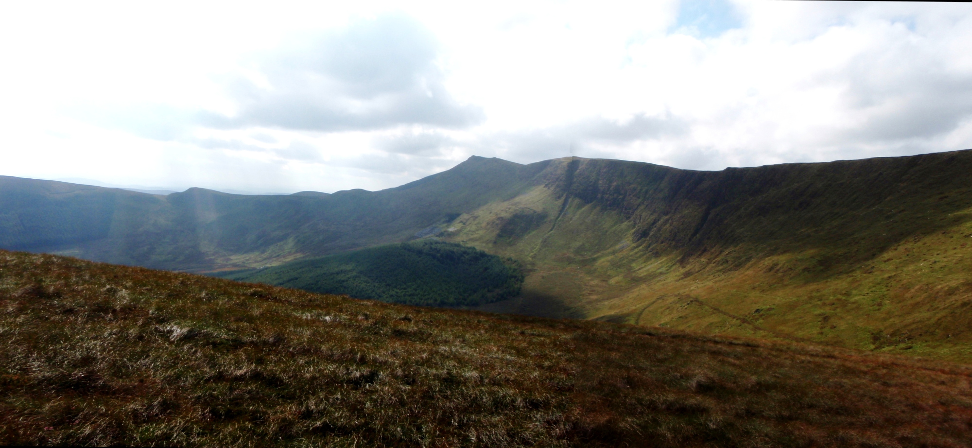 The plan was to follow the ridge line over Mynydd Tarw, Foel Wen and Tomle to join the Berwyn Ridge, then crossing Cadair Berwyn before dropping down onto Moel yr Ewig to return via Godor – in effect doing a horseshoe route of Cwm Maen Gwynedd. After a short ascent of Mynydd Tarw, the way ahead was a long roller-coaster ride, with great views towards the Berwyn Ridge.