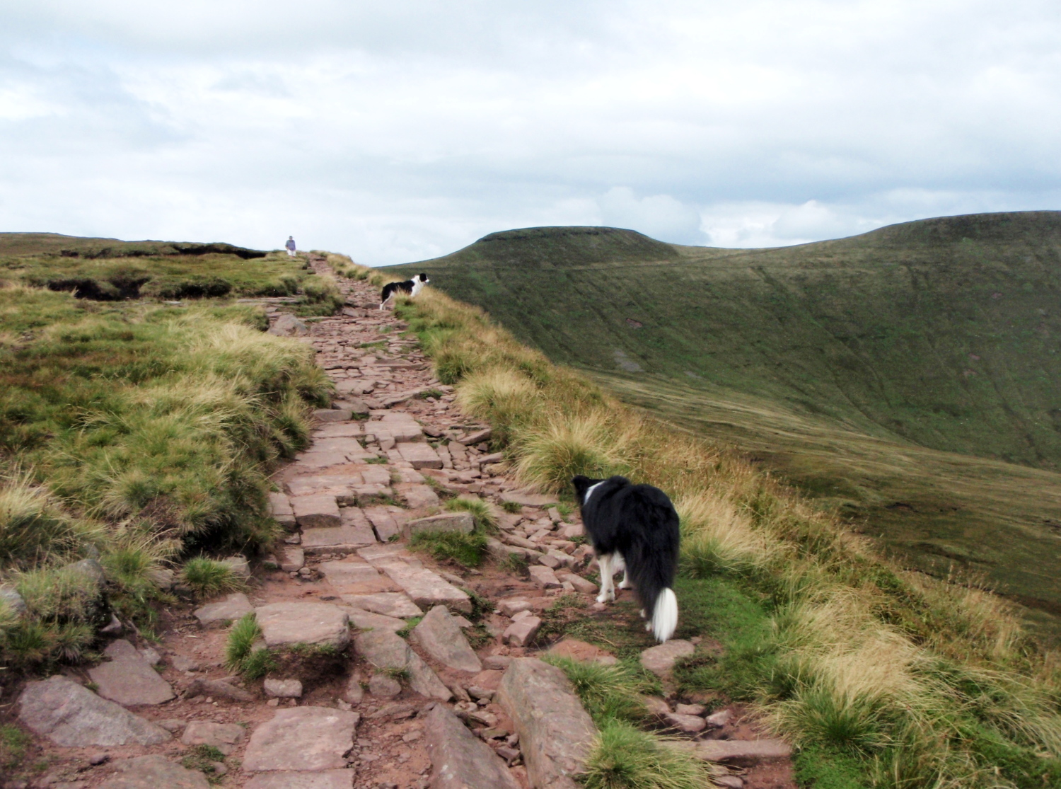 Having made our major height gain for the day, the route now was a steady wander towards Corn Du and Pen y Fan. The broad ridge narrowed at Rhiw yr Ysgyfarnog, but not enough to bother Chris who isn’t too keen on big drops. The main interest for the humans was the unmistakable skyline ahead, but ‘Mist’ was far more interested in another Border Collie heading towards us!