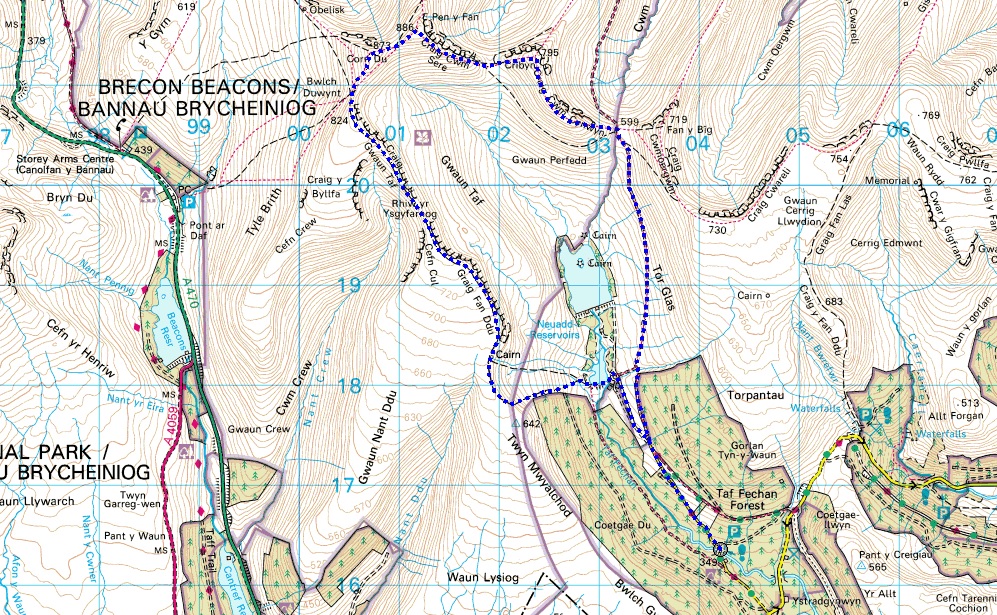 Our trips to Mid and South Wales usually include a visit to friends, and Barbara was up for a walk in the Beacons as part of her preparation for a trekking trip in the Himalayas. The horseshoe circuit from the Neuadd Reservoirs looked good on the map, and included the summits of Graig Fan Ddu, Corn Du, Pen y Fan and Cribyn. With a good weather forecast thrown in, we had all the ingredients to make a good day out.