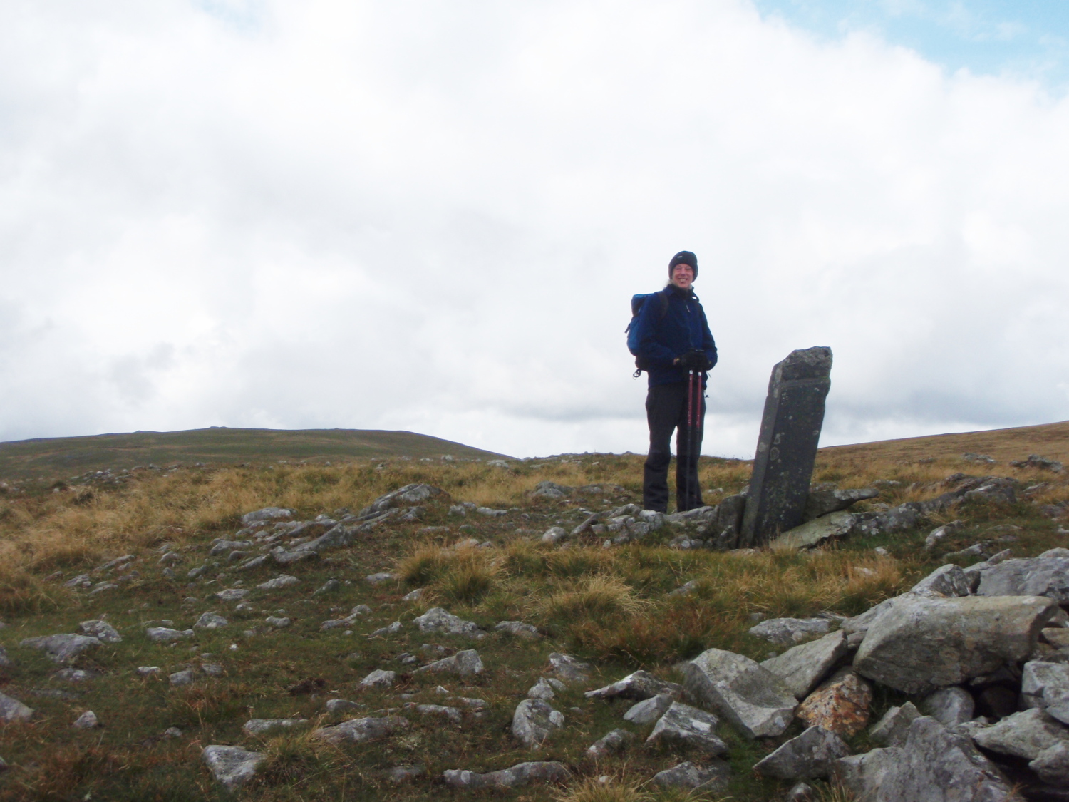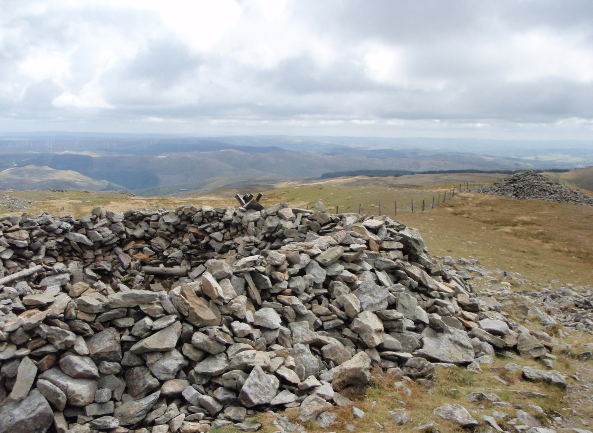 As with many of the summits of Welsh mountains, the top was crowned with an ancient Bronze Age burial cairn, probably 4-5000 years old – another common feature of such summits is that the stones of the cairn are often ransacked to build wind shelters, and this was no exception, though I suppose we might have been more grateful had the weather been bad…