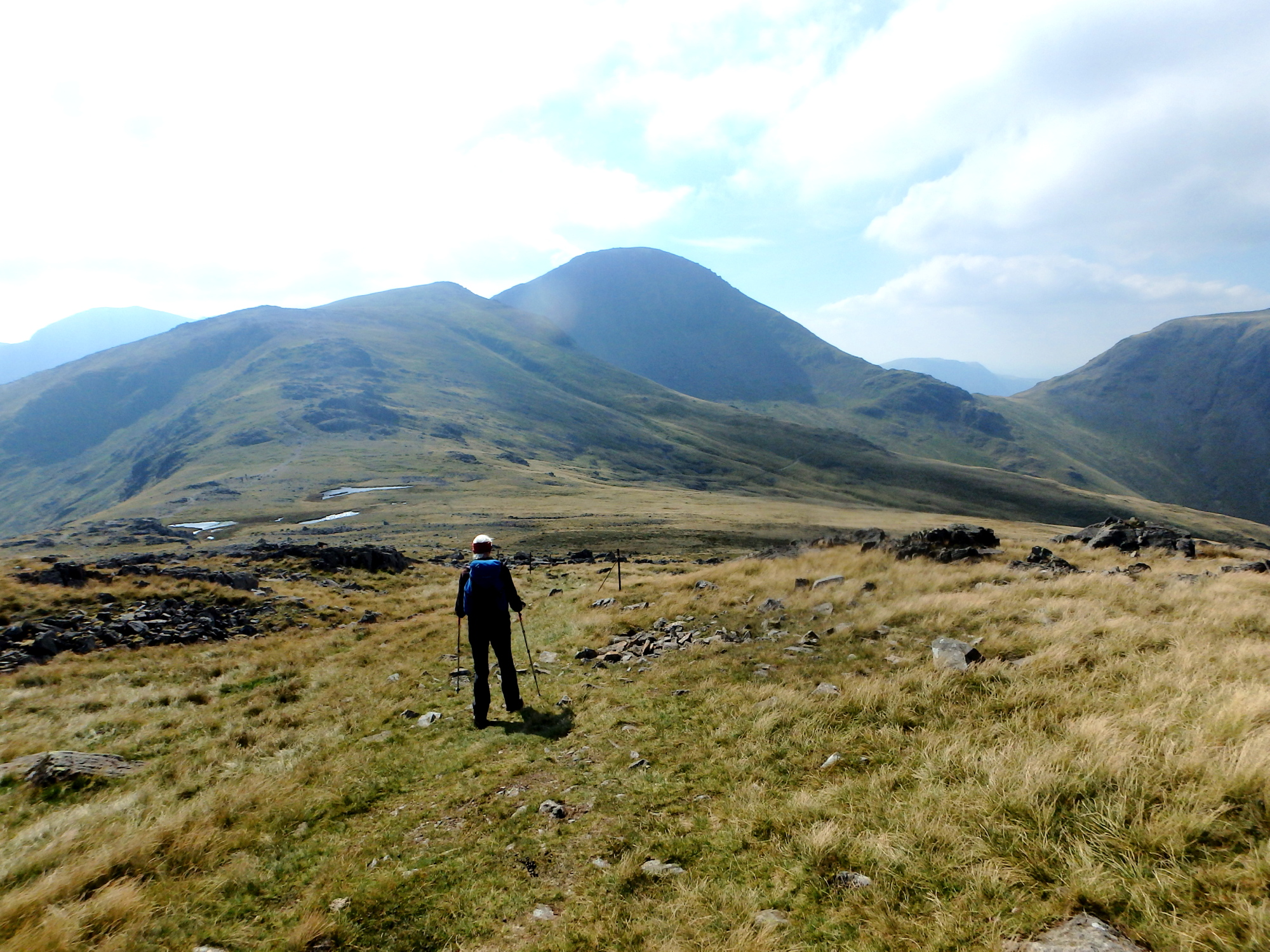 The steep bit levels out on Grey Knotts, after 340 metres of height gain in not much more than 1 km of walking. From there things settle down a bit with an undulating wander over Brandreth and Green Gable. There are great views across to Ennerdale with Pillar quite unmistakable, before Great Gable suddenly looms into view – it must have been impressive because Chris said, “Are we going there?” in that sort-of disbelieving way.
