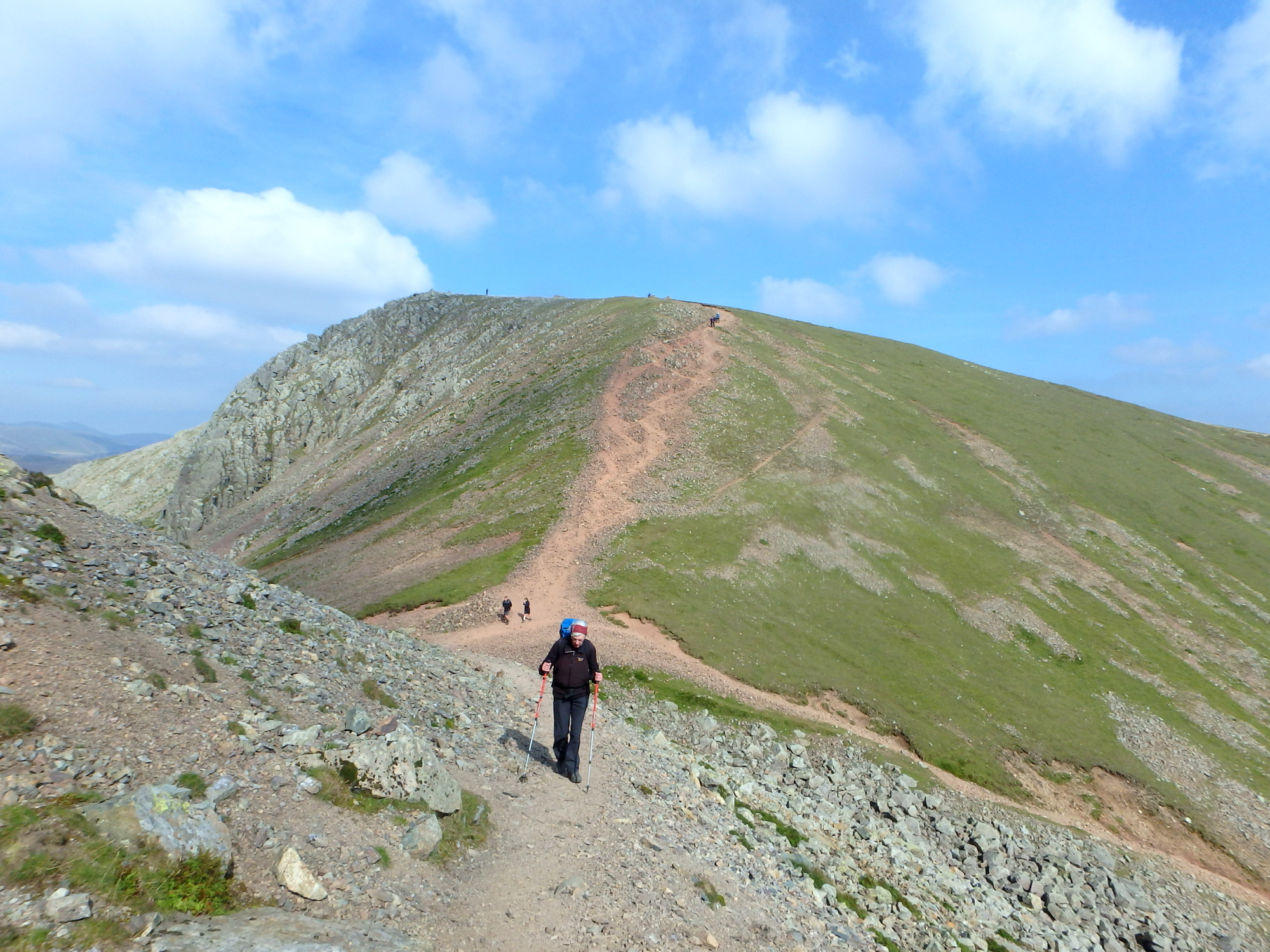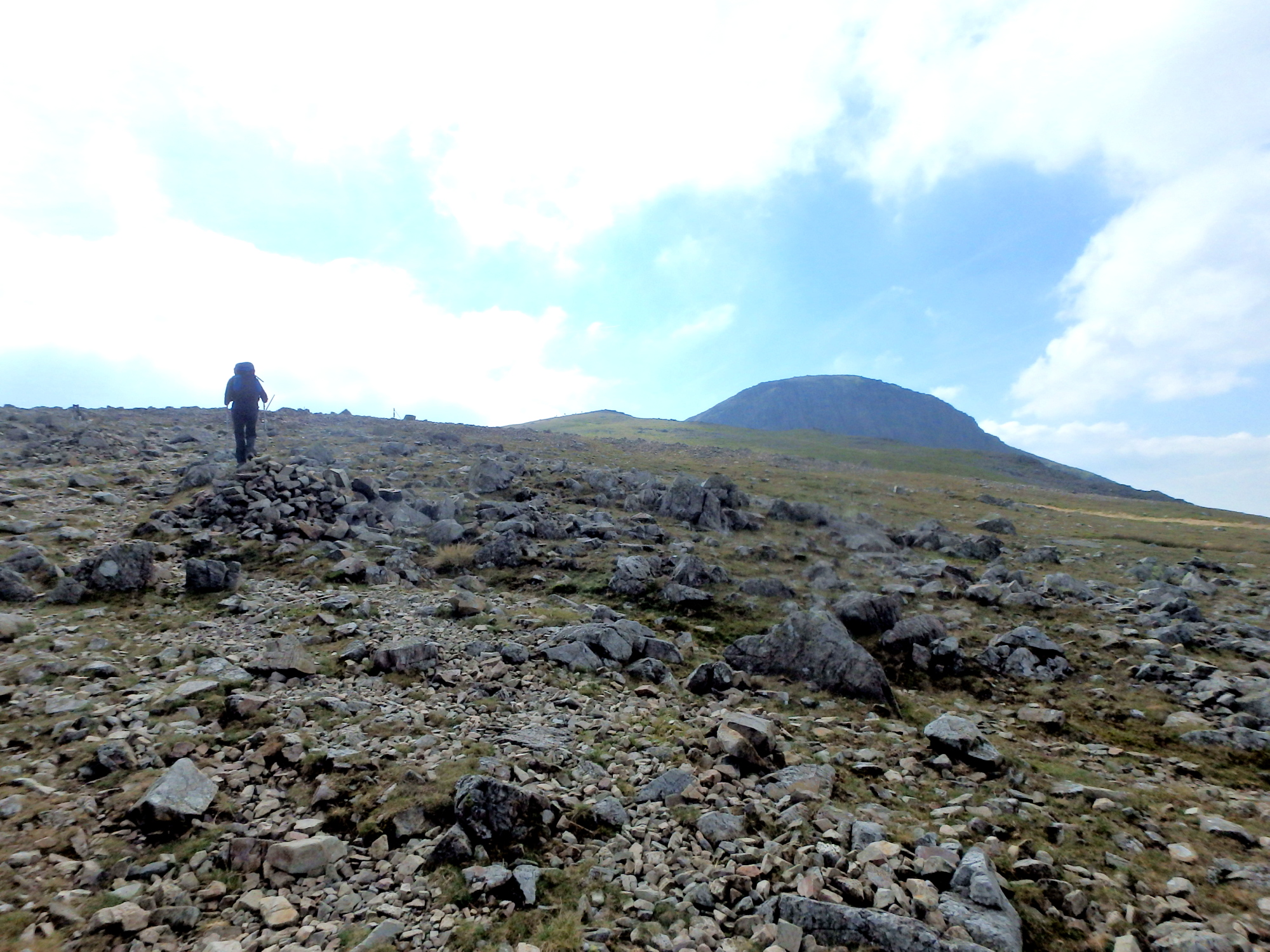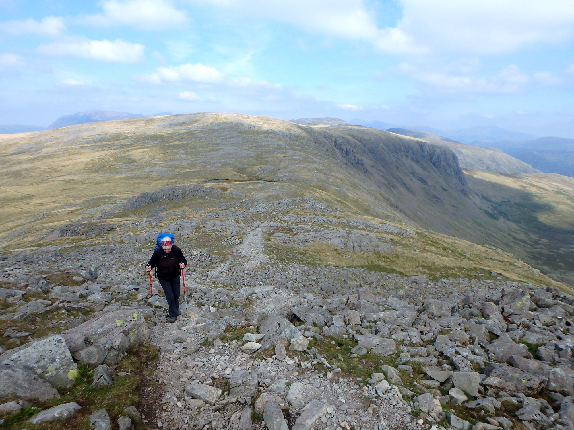 What goes up has to come down, and I had chosen the descent to the northwest heading down to the col at Beck Head. I tried to avoid a steep craggy section that Chris would not have enjoyed, and landed instead on the scree slopes about 100 metres south of where we should have been. If Chris doesn’t like ‘steep craggy’ ground, she is even less keen on ‘steep scree’ but perseverance and patience eventually got us to Beck Head.