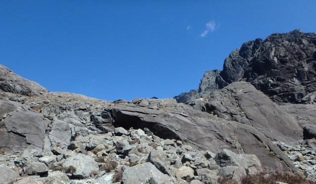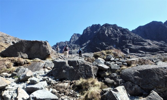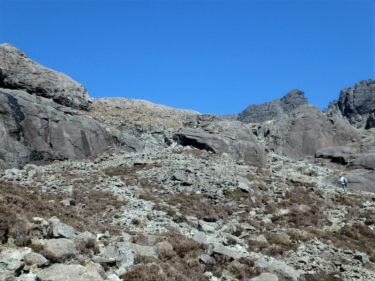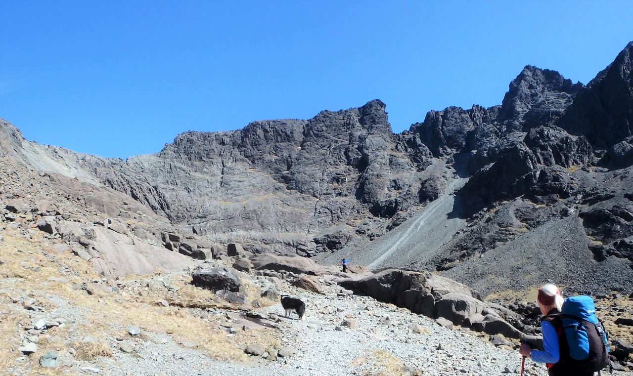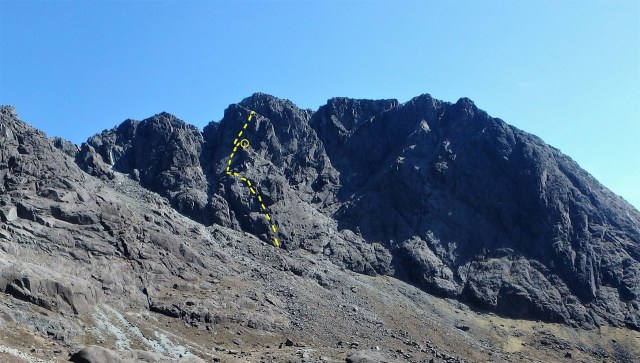 Beyond the small loch, the path heads up to the impressive Coire Lagan – the mountain scenery becomes more and more impressive, though the views behind looking out to sea tick a few boxes as well. In the corrie, one feature dominates above the rest – this is the impressive set of cliffs that make up the crags of Sron na Ciche. It’s hard to appreciate the size of the place at first – suffice it to say, there are a couple of 1300 ft (400 metre) rock climbs with several more approaching that length. It’s an impressive place to climb.