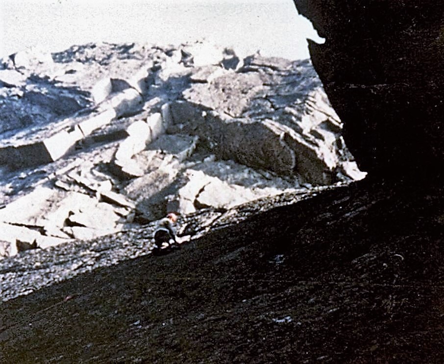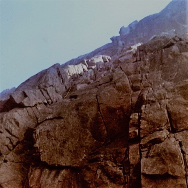One of my earliest climbs here in 1972 was a combination of three linked routes. We started on Cioch Direct (500 ft/150 metres) followed by Arrow route (200 ft/60 metres) – Cioch Direct has re-assuring chimneys and cracks which give an illusion of security, whereas Arrow route, although a grade easier, takes off up an almost bare slab. On arrival, the top of Arrow Route gives access to an amazing rock feature, The Cioch (see photos below).