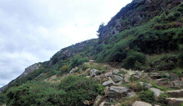The hill rears up steeply on three out of four sides, and we had one of the steep sides as our way up. The path started OK on grass but then became steeper with a set of loose-looking stone steps heading upwards. Chris didn’t seem all that impressed with the state of the path, but it turned out to be solid enough, even if it did start gaining altitude fairly rapidly – at least the views helped to distract her a bit.