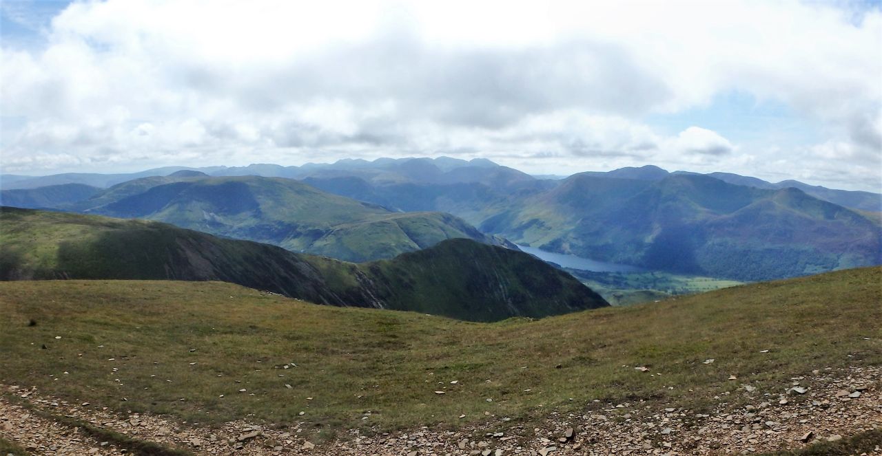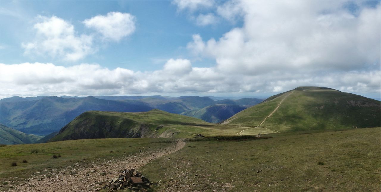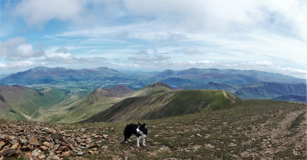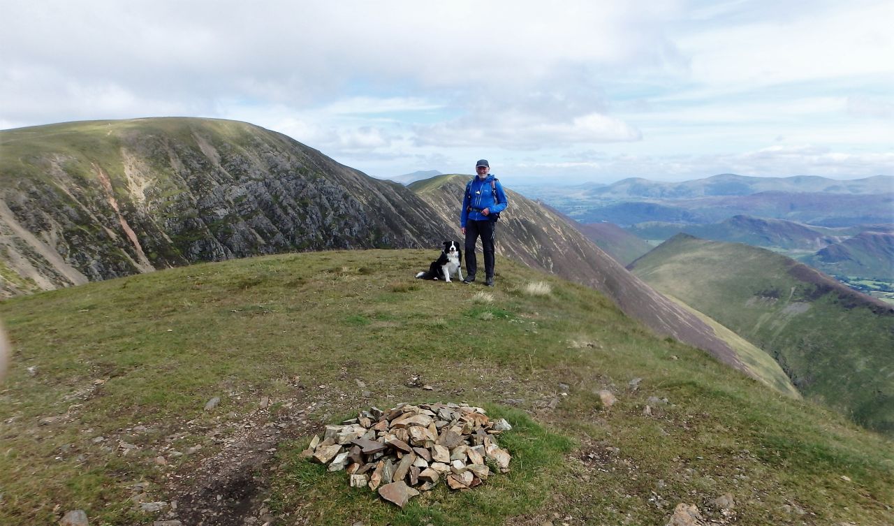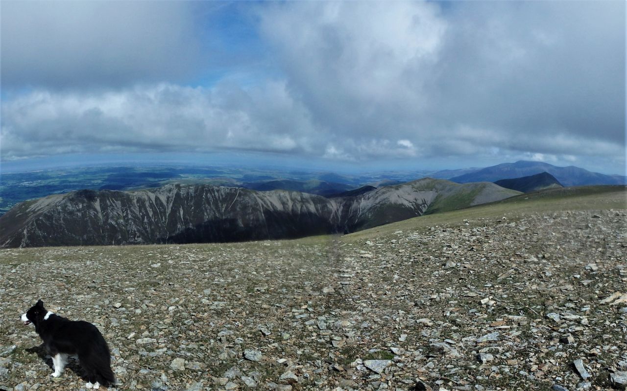 On the summit of Crag Hill looking down the Coledale valley, with Skiddaw and Blencathra in the distance to the left and the Helvellyn Range on the skyline from the centre running to the right.