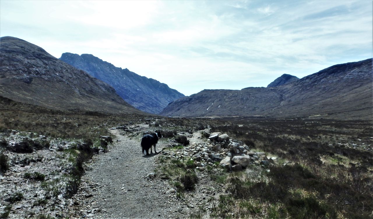 As I crossed the col where I had stopped on the way out, ‘Mist’ immediately went in search of any lost crumbs – Border Collies are a bit too clever at times!    Then it was the long return to Glen Sligachan – I don’t find ‘out and back’ trips boring, as you get to see everything from a new perspective, but as we approached the Sligachan Hotel I suspect that the only thing ‘Mist’ wanted to see was a full dinner dish.