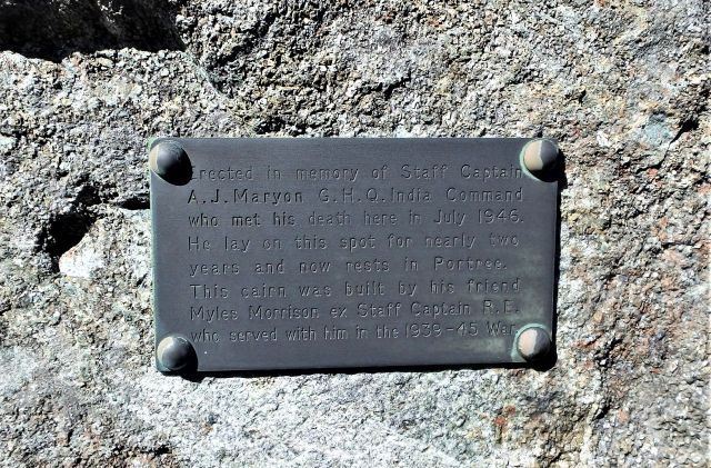 The time came, as it always does, to start heading back.   I almost bumped into a small group of red deer, who didn’t seem at all phased by the presence of me and the dog.   I unintentionally lost a bit of height trying not to spook them, which dropped me conveniently at the memorial cairn dedicated to Captain Maryon.  The cairn marks the spot where Maryon died in July 1946 – his body was not discovered for nearly two years.