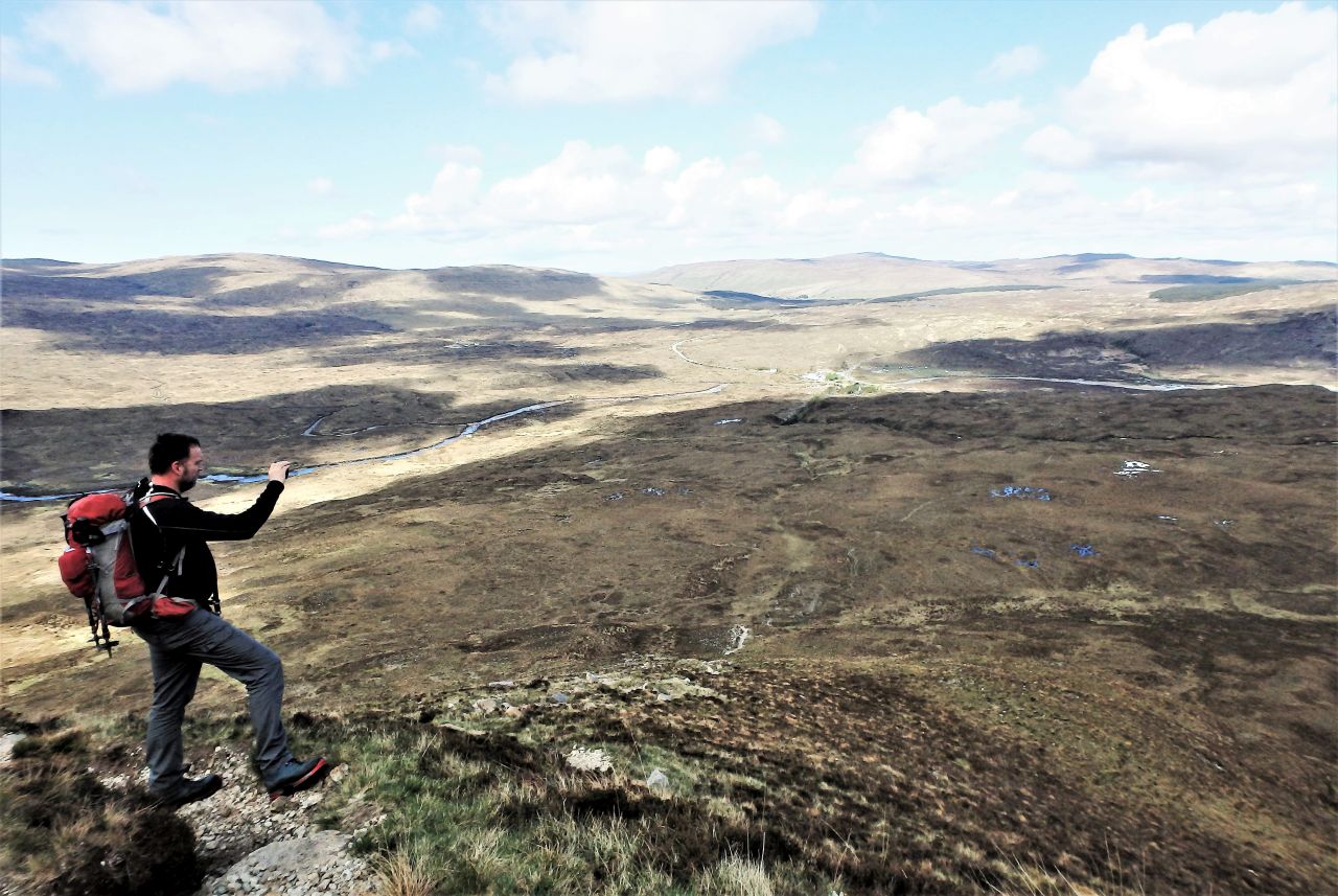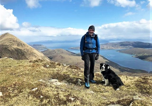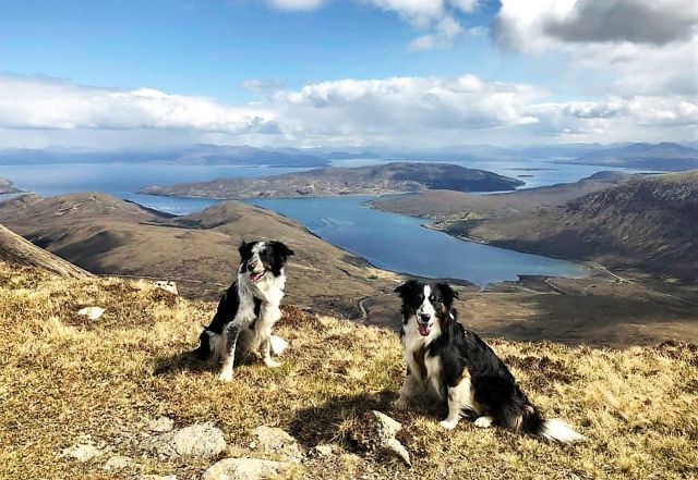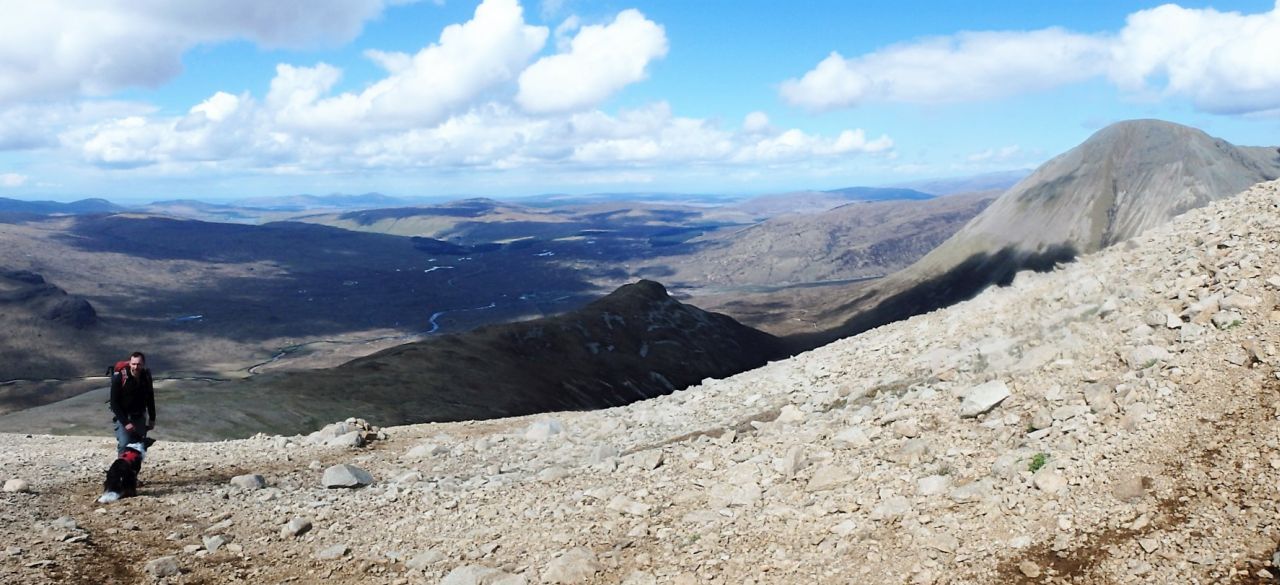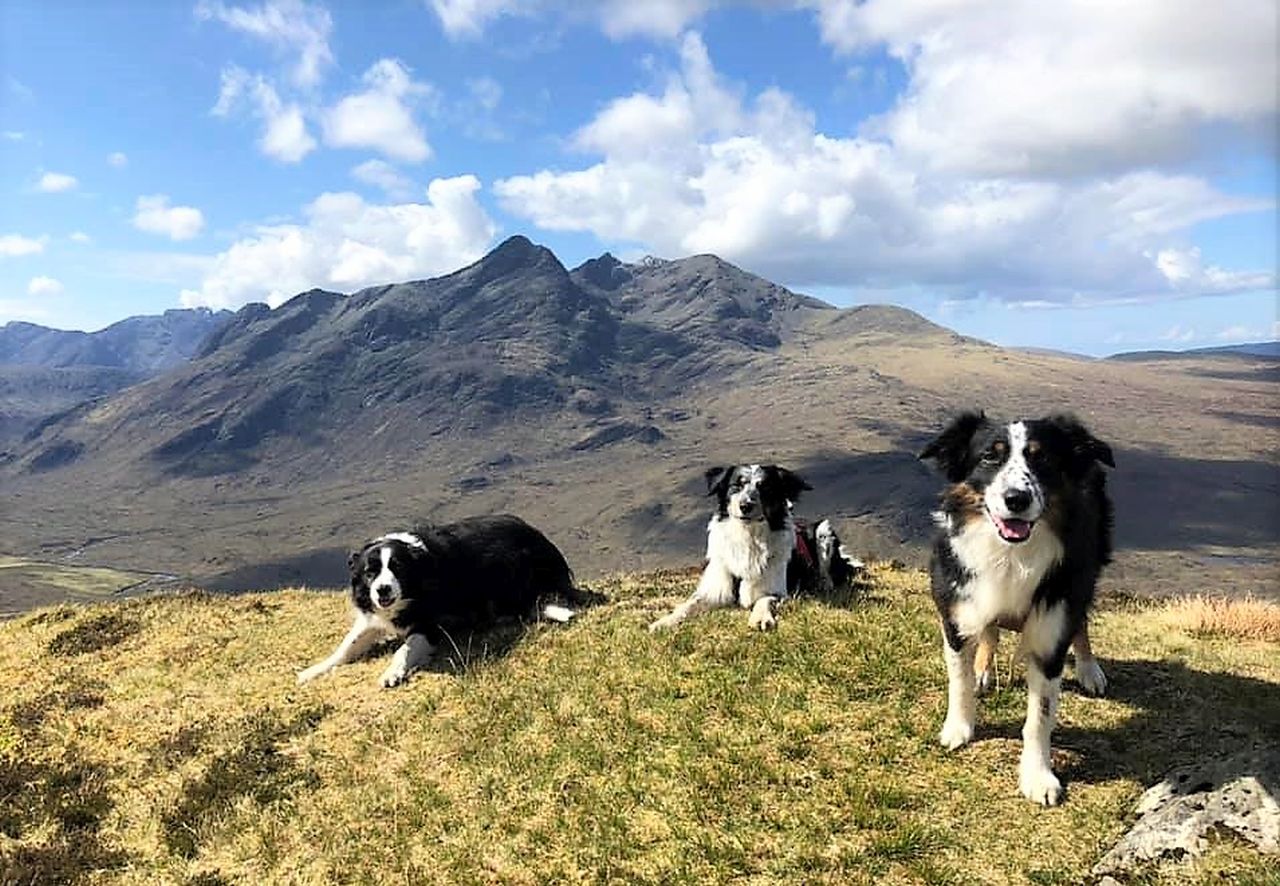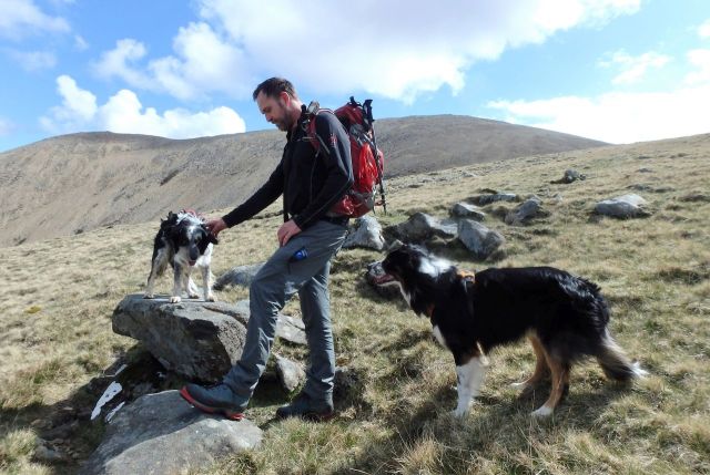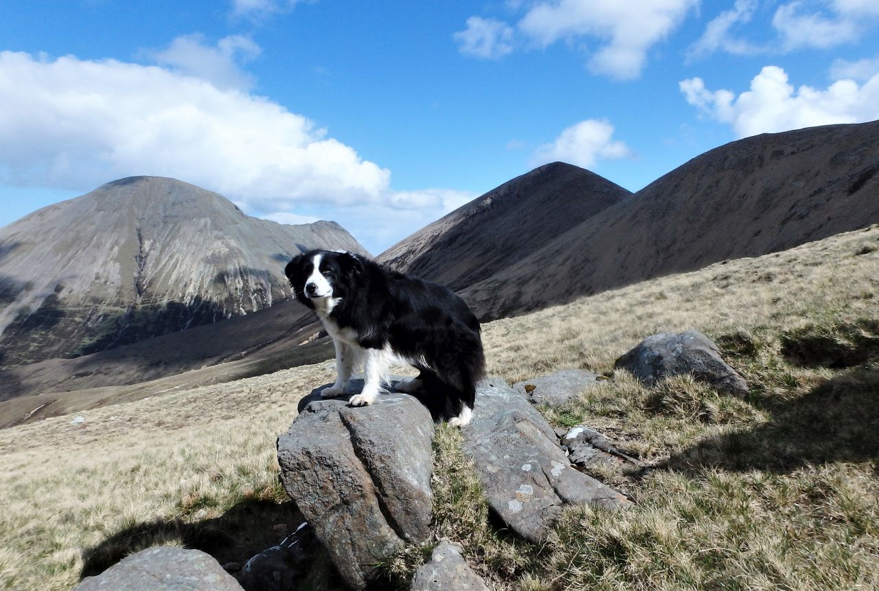 Most of my mountain days are solo, apart from the company of Border Collie ‘Mist’, who is the ideal mountain dog, never complaining and always willing – especially if there’s a chance of a sandwich! Today we had company for a change with Richie, a mate from NEWSAR (the mountain rescue team back home) and his two collies ‘Caizer’ and ‘AJ’. The weather was set to be fair with blue skies and a cooling breeze, and as this was in May, there wasn’t a midge in sight. Perfect!