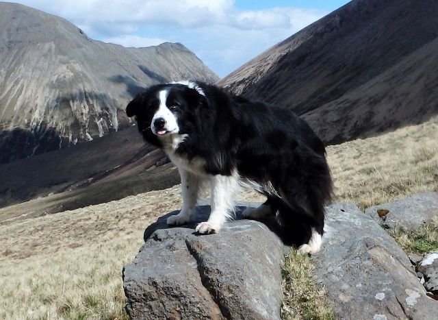 The final rising section of Druim na Ruaige heading up to Beinn Dearg Mheadhonach was pleasant enough, with time and opportunity for a bit of canine photography (that’s photos of the dogs, obviously – they aren’t very good at remembering things such as shutter speeds and f-stops, and their paws are a bit clumsy on the focusing). Caizer is the ideal ‘doggy model’, and his main aim in life seems to be to please Richie and Babs by posing on pointy rocks. ‘Mist’, on the other hand, doesn’t share Caizer’s enthusiasm, and I could swear she was sticking her tongue out at me before finally giving me the classic Border Collie pose.