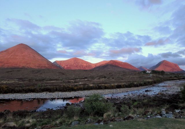 On the way back to the bar at Sligachan (yep, that’s the option we came up with), the dogs had a chance to cool down in the crystal-clear pools or the Allt Daraich. From there, a short wander over the boggy moor took us back to a cold cider at the Slig. We were blessed with a great sunset later on, with a bit of a red glow on the Black Cuillins – on the other side of Glen Sligachan, the Red Cuillins were looking very, very red.