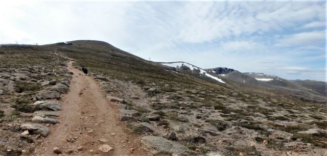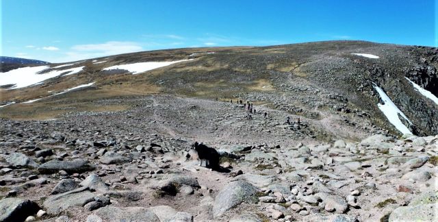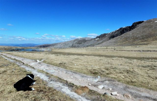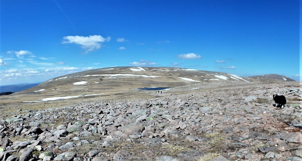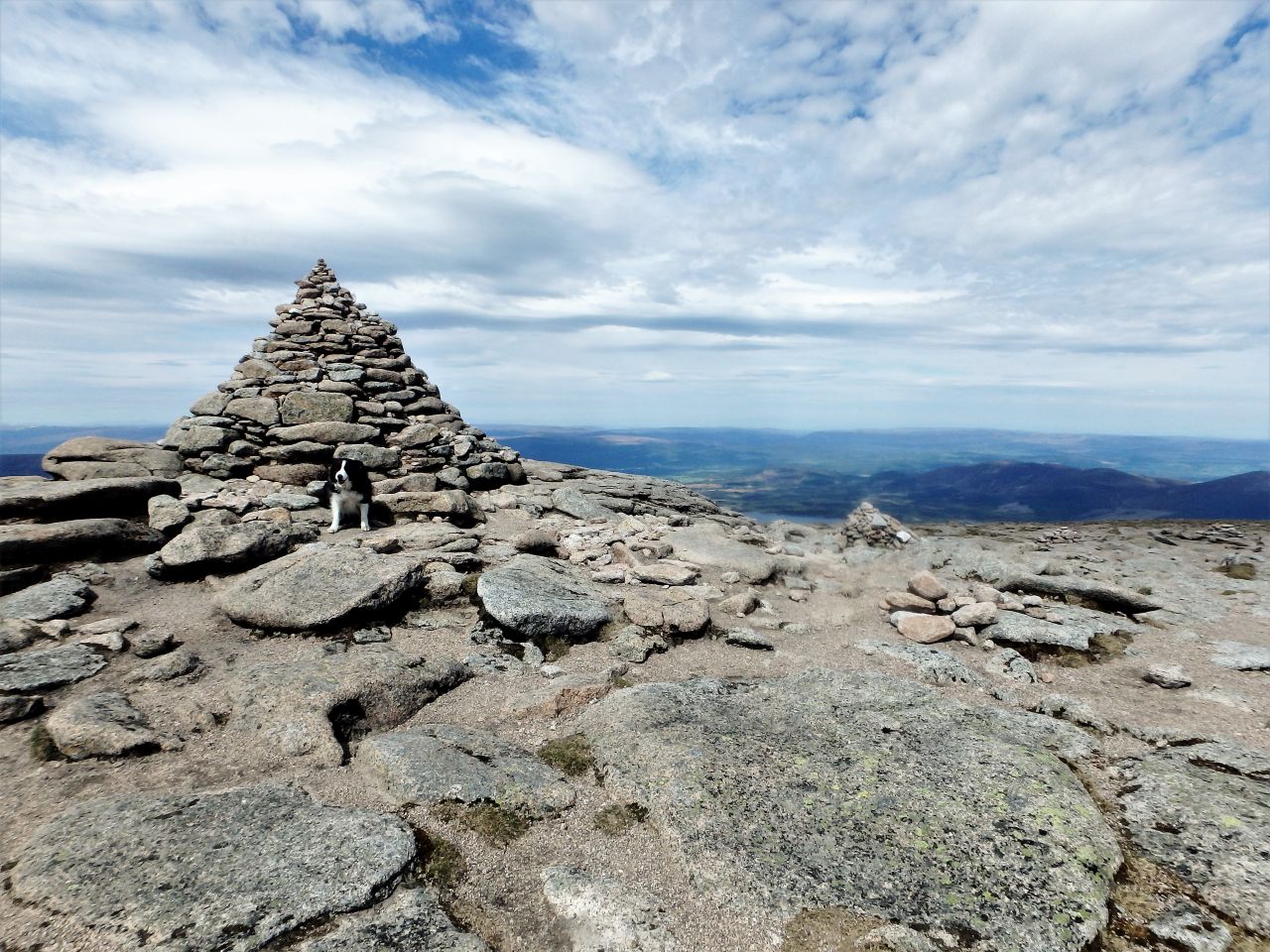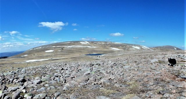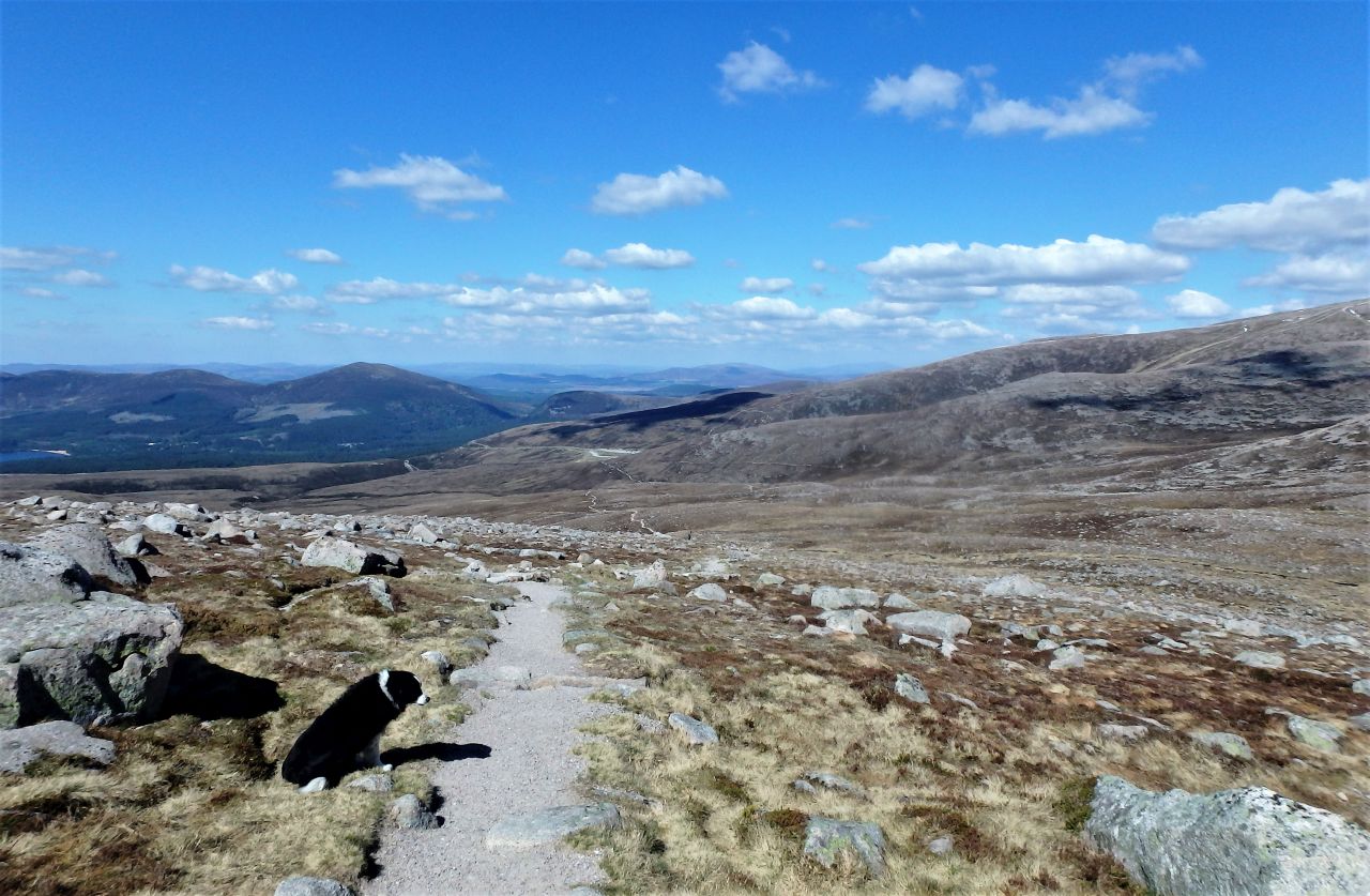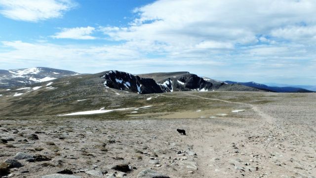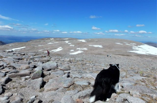 Leaving those sad memories behind me, I pressed on with Border Collie ‘Mist’ towards Ben Macdui. It’s not a pretty mountain in itself but it makes a magnificent viewpoint overlooking much of the main Cairngorm Plateau. It was surprisingly busy at the summit, as everyone else seemed to have decided to have a lunch stop at the same time. ‘Mist’ took the opportunity to go scrounging for a morsel or two.